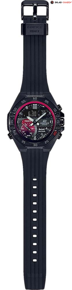 Новинка в серии Edifice ECB - многофункциональный аксессуар который станет настоящим помощником для настоящего мужчины. Edifice. Лимитированная серия создана совместно с гоночной командой TOM'S, которая была основана в 1974 году и является выдающейся гоночной командой Японии. Новинка выпущена в честь 20-ти летия хронографа Edifice. Карбоновый циферблат подсвечивается ярким светодиодом, включаемым поворотом запястья. Цвет подсветки: белый. Необритовое светонакопительное покрытие обеспечивает длительное послесвечение в темноте даже после кратковременного нахождения на свету. 12-ти и 24-х часовой формат времени. Секундомер с двумя точностями показаний: 1/1000с (до 1ч) и 1/10с (после 1ч) и временем измерения 24ч. SPLIT-хронограф. Память на 200 кругов. Таймер обратного отсчета от 1с до 100ч. Таймер расписания синхронизируется с календарем в смартфоне и производит обратный отсчет до начала назначенного в календаре события. Мировое время – 39 городов (39 часовых поясов), всемирное координированное время (UTC). Автоматический переход на зимнее и летнее время, возможность включения/отключения данной функции. Беспроводная технология Bluetooth® 4.0 со сверхнизким потреблением энергии для синхронизации со смартфоном. При подключении к смартфону часы автоматически корректируют текущее время, в том числе переход на зимнее/летнее время, копируют настройки мирового времени более чем для 300 городов, оповещают при поступлении звонка на мобильный телефон. Авиарежим позволяет отключить радио- и GPS-приемник на время перелета. Приложение EDIFICE Connected позволяет вести журнал показаний секундомера и прохождения этапов, вычислять разность между заданным временем и временем этапа. Отображение дней недели на разных языках. Функции перемещения стрелок для беспрепятственного просмотра информации на цифровых дисплеях, отключения/включения звука и поиска телефона. Заводная головка с защитой. Ремешок из полимерного материала с классической застежкой.