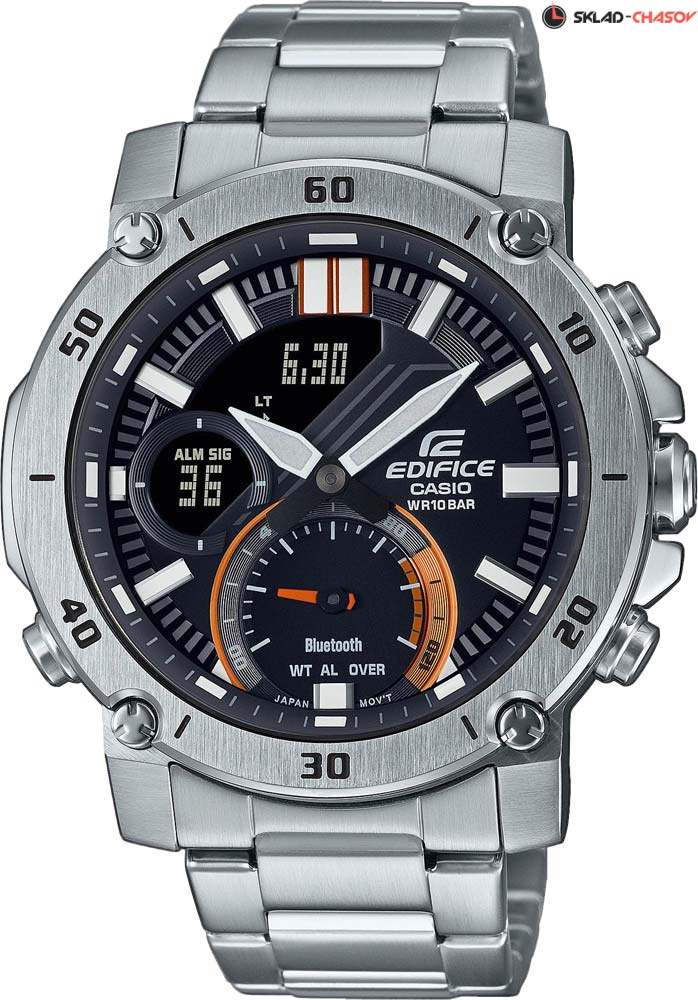 С новинкой Edifice вы получаете не просто аксессуар, а настоящий многофункциональный гаджет, который станет верным помощником для современного мужчины. Edifice. Лимитированная серия создана совместно с гоночной командой Scuderia AlphaTauri Formula 1, которая до 2020 года называлась Scuderia Toro Rosso. Новинка выполнена в сине-белых цветах. Светодиодная автоматическая супер-подсветка. При наклоне часов в сторону лица для считывания, функция автоподсветки обеспечивает автоматическое включение супер-яркой подсветки. Цвет подсветки: белый. Необритовое светонакопительное покрытие обеспечивает длительное послесвечение в темноте даже после кратковременного нахождения на свету. 12-ти и 24-х часовой формат времени. Секундомер с двумя точностями показаний: 1/1000с (до 1ч) и 1/10с (после 1ч) и временем измерения 24ч. SPLIT-хронограф. Память на 200 кругов. Таймер обратного отсчета от 1с до 24ч. Мировое время – 38 городов (38 часовых поясов), всемирное координированное время (UTC). Автоматический переход на зимнее и летнее время, возможность включения/отключения данной функции. Переключение между домашним и мировым временем. Второй часовой пояс отображается на цифровом дисплее. Беспроводная технология Bluetooth® 4.0 со сверхнизким потреблением энергии для синхронизации со смартфоном. При подключении к смартфону часы автоматически корректируют текущее время, в том числе переход на зимнее/летнее время, копируют настройки мирового времени, оповещают при поступлении звонка на мобильный телефон. Авиарежим позволяет отключить Bluetooth-приемник на время перелета. Приложение EDIFICE Connected позволяет вести журнал показаний секундомера и прохождения этапов, вычислять разность между заданным временем и временем этапа. Отображение дней недели на шести языках. Функции перемещения стрелок для беспрепятственного просмотра информации на цифровых дисплеях, поиска телефона и отключения/включения звука по расписанию. Вращающийся безель. Заводная головка с защитой. Раскладывающаяся тройная застежка, расстегиваемая одним касанием. Предохранительная защелка на браслете препятствует случайному расстегиванию.