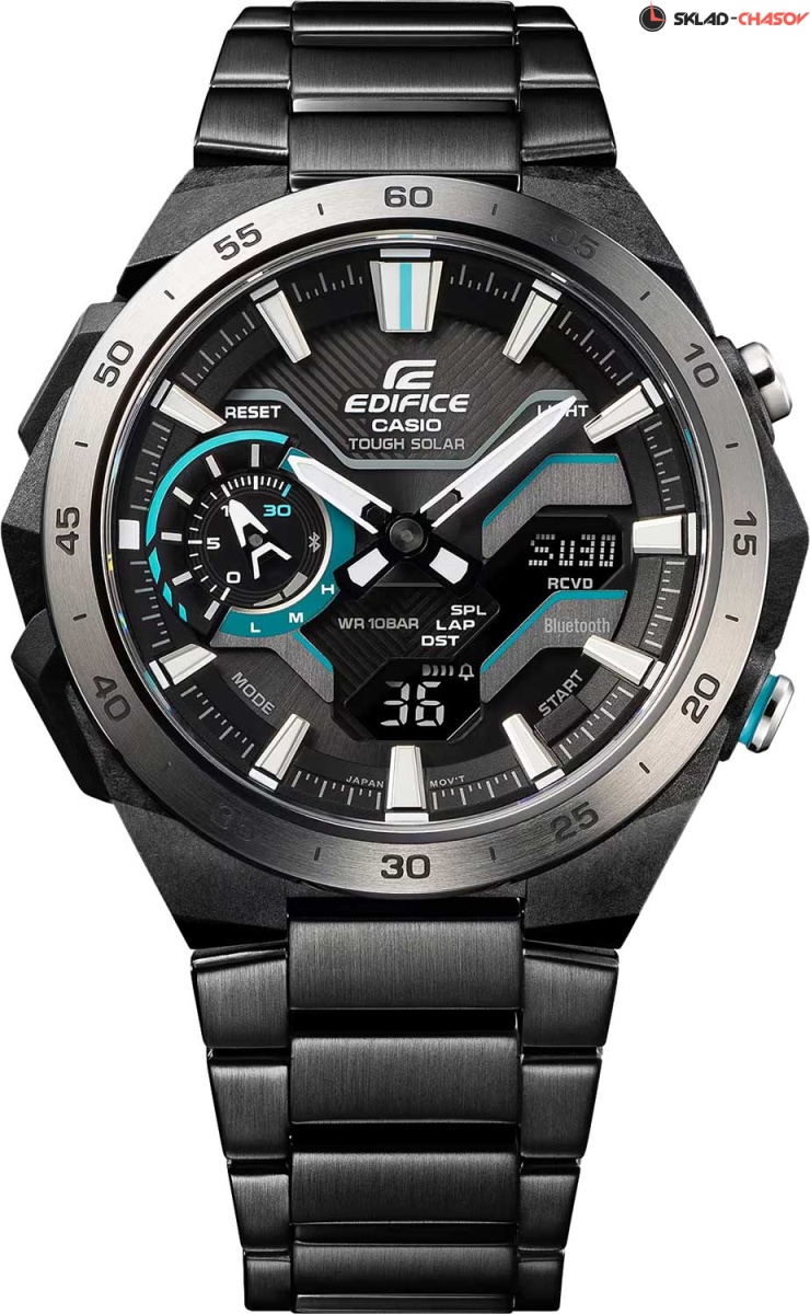 Очередная новинка в серии Edifice не останется без внимания поклонников этого японского бренда. Edifice Windflow. Мужские часы, дизайн которых вдохновлен воздушным потоком вокруг гоночного автомобиля. Питание от солнечной энергии Tough Solar - солнечные батарейки большой мощности, индикатор заряда батареи. Функция автоматического сохранения энергии. Время работы аккумулятора без подзарядки приблизительно 7 месяцев, при включенной функции сохранения энергии приблизительно 18 месяцев. Двойная подcветка: циферблат и ЖК-дисплеи подсвечиваются светодиодом, благодаря наличию функции задержки, после отпускания кнопки освещение горит еще несколько секунд. Настраиваемое послесвечение 1,5 или 3сек. Цвет подсветки: белый. Необритовое светонакопительное покрытие обеспечивает длительное послесвечение в темноте даже после кратковременного нахождения на свету. 12-ти и 24-х часовой формат времени. Секундомер с двумя точностями показаний: 1/100с (до 1ч) и 1с (после 1ч) и временем измерения 24ч. SPLIT-хронограф. Таймер обратного отсчета от 1с до 1ч. Мировое время – 38 городов (38 часовых поясов), всемирное координированное время (UTC). Автоматический переход на зимнее и летнее время, возможность включения/отключения данной функции. Переключение между домашним и мировым временем. Отображение кода и названия города. Беспроводная технология Bluetooth® со сверхнизким потреблением энергии для синхронизации со смартфоном. При подключении к смартфону часы корректируют текущее время, настраивают будильник, а также копируют настройки мирового времени (до 300 городов). Отображение дней недели на шести языках. Функции перемещения стрелок для беспрепятственного просмотра информации на цифровых дисплеях, отключения/включения звука и поиска телефона. Водонепроницаемость 10 Бар в соответствии с ISO 2281. Браслет с раскладывающейся тройной застежкой, расстегиваемой одним касанием.