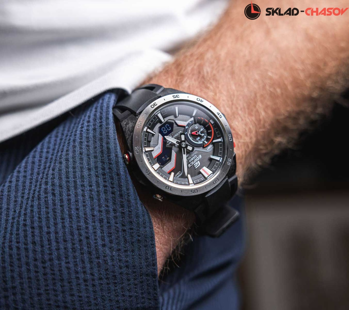 Очередная новинка в серии Edifice не останется без внимания поклонников этого японского бренда. Edifice Windflow. Мужские часы, дизайн которых вдохновлен воздушным потоком вокруг гоночного автомобиля. Питание от солнечной энергии Tough Solar - солнечные батарейки большой мощности, индикатор заряда батареи. Функция автоматического сохранения энергии. Время работы аккумулятора без подзарядки приблизительно 7 месяцев, при включенной функции сохранения энергии приблизительно 18 месяцев. Двойная подcветка: циферблат и ЖК-дисплеи подсвечиваются светодиодом, благодаря наличию функции задержки, после отпускания кнопки освещение горит еще несколько секунд. Настраиваемое послесвечение 1,5 или 3сек. Цвет подсветки: белый. Необритовое светонакопительное покрытие обеспечивает длительное послесвечение в темноте даже после кратковременного нахождения на свету. 12-ти и 24-х часовой формат времени. Секундомер с двумя точностями показаний: 1/100с (до 1ч) и 1с (после 1ч) и временем измерения 24ч. SPLIT-хронограф. Таймер обратного отсчета от 1с до 1ч. Мировое время – 38 городов (38 часовых поясов), всемирное координированное время (UTC). Автоматический переход на зимнее и летнее время, возможность включения/отключения данной функции. Переключение между домашним и мировым временем. Отображение кода и названия города. Беспроводная технология Bluetooth® со сверхнизким потреблением энергии для синхронизации со смартфоном. При подключении к смартфону часы корректируют текущее время, настраивают будильник, а также копируют настройки мирового времени (до 300 городов). Отображение дней недели на шести языках. Функции перемещения стрелок для беспрепятственного просмотра информации на цифровых дисплеях, отключения/включения звука и поиска телефона. Водонепроницаемость 10 Бар в соответствии с ISO 2281. Ремешок с классической застежкой.