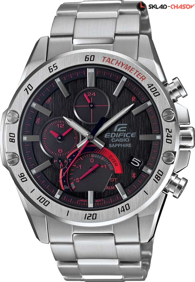 Часы-хронограф с секундомером и тахиметрической шкалой. Питание от солнечной энергии Tough Solar - солнечные батарейки большой мощности, индикатор низкого заряда батареи. Необритовое светонакопительное покрытие обеспечивает длительное послесвечение в темноте даже после кратковременного нахождения на свету. Секундомер с точностью показаний 1/1000 сек. и временем измерения 24 часа. Память на 200 кругов. Индикатор последнего круга – полезная функция для тех, кто следит за гонками и их результатами, учитывая, что последние меняются при прохождении каждого круга. Дисплей на циферблате показывает разницу между текущим временем круга и временем предыдущего круга в диапазоне от –5 до +1 секунды. Второй часовой пояс - одновременное отображение текущего времени и времени в другом часовом поясе. Беспроводная технология Bluetooth® Smart 4.0 со сверхнизким потреблением энергии для синхронизации со смартфоном. Автоматическое подключение к серверу времени через смартфон 4 раза в день для корректировки текущего и настроек мирового времени (до 300 городов). Мировое время. Функция поиска телефона. Функция ежечасного сигнала. Заводная головка с защитой. Литой браслет с раскладывающейся застежкой, расстегиваемой одним касанием. Вес 130 грамм. Гарантия 2 года. Функции: Будильник. Второй часовой пояс. Секундомер. Число. Солнечная батарея. Bluetooth. Мировое время. Комплектация: Часы, фирменная упаковка, фирменный пакет, инструкция на русском языке, заполненный гарантийный талон.