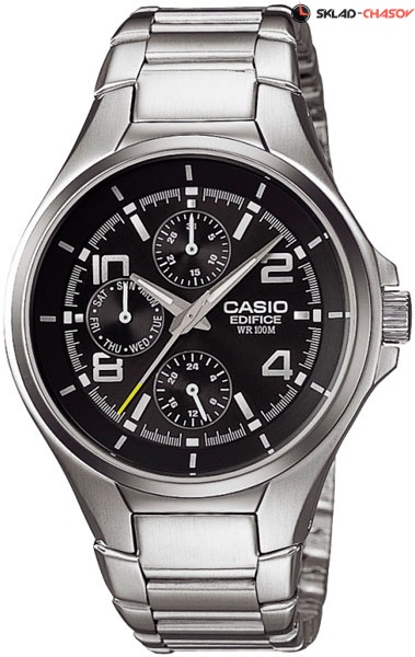 12-ти и 24-х часовой формат времени. Число и день недели вынесены на отдельные циферблаты. Точность хода ±20 секунд в месяц, заряд батареи 2 года. Заводная головка с защитой. Завинчивающаяся задняя крышка. Браслет с раскладывающейся застежкой. Застежка с системой блокировки.