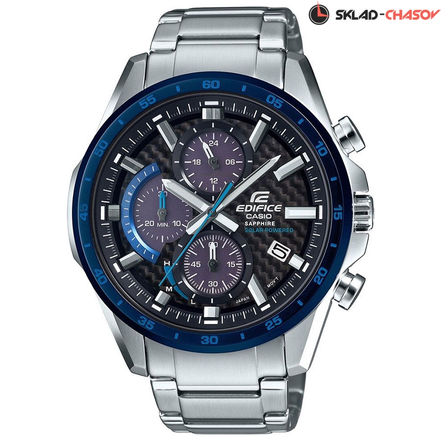 Кварцевый хронограф на солнечной батарее. Индикатор заряда батареи. Стрелки и метки с люминесцентным покрытием. Часы, минуты, секунды, дата. Корпус выполнен из нержавеющей стали с частичным IP покрытием. Диаметр корпуса 48 мм, толщина 12 мм. Стальной браслет. Устойчивое к возникновению царапин сапфировое стекло. Завинчивающаяся задняя крышка. Водостойкость WR 100.