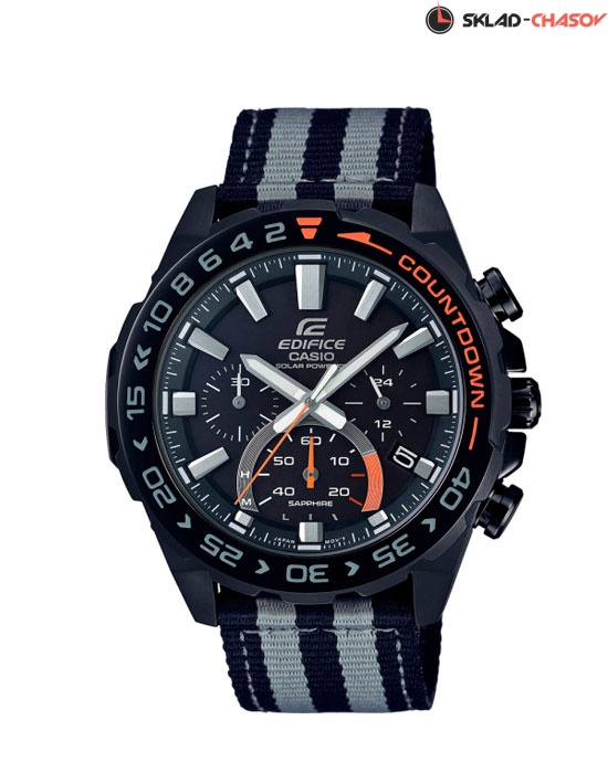 Кварцевый хронограф. Солнечная батарея. Индикатор заряда батареи. Водонепроницаемость WR 100. Часы, минуты, секунды, хронограф. Индикация даты на позиции четырех часов. Стрелки и метки с люминесцентным покрытием. Черный циферблат с часовыми индексами в виде штрихов и арабских цифр. Корпус выполнен из нержавеющей стали с IP покрытием. Диаметр корпуса 47 мм , толщина 12 мм. Устойчивое к возникновению царапин сапфировое стекло. Заводная головка с защитой. Текстильный ремешок.