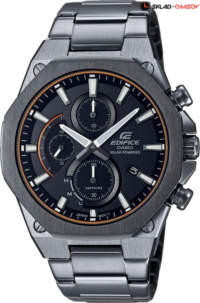 Стильный аксессуар со спортивным духом выбирают активные и целеустремленные мужчины. Edifice. Новинка в коллекции часов Edifice. Ультратонкие. Питание от солнечной энергии, индикатор уровня зарядки батареи. Необритовое светонакопительное покрытие обеспечивает длительное свечение в темноте даже после кратковременного нахождения на свету. Часы-хронограф с секундомером, время измерения 60мин. Секундная стрелка вынесена на отдельный циферблат. Метки в виде штрихов. Окошко даты находится в положении 4 часа. Восьмиугольный безель. Заводная головка с защитой. Водонепроницаемость в соответствии с ISO 2281. Тройная раскладывающаяся застежка, расстегиваемая одним касанием. Застежка с системой блокировки.