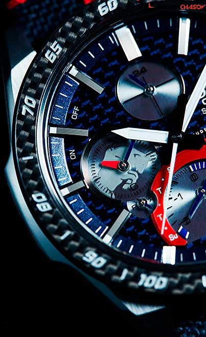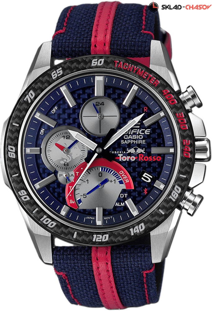 Хронограф Edifice в цветах команды Формулы-1 Scuderia Toro Rosso. Edifice. Эта лимитированная cерия посвящена команде Формулы-1 Scuderia Toro Rosso, которую поддерживает EDIFICE. Синяя, красная и серебряная окраска автомобилей команды SCUDERIA TORO ROSSO используется для создания часов. Инженеры разработали более тонкий механизм, что позволило добиться толщины корпуса в 8,9мм. Для сравнения в предыдущей модели EQB-900 толщина корпуса составляет 12мм. Питание от солнечных батарей Tough Solar, обладающих повышенной мощностью. Индикатор низкого заряда батареи. Функция автоматического сохранения энергии. Время работы аккумулятора без подзарядки приблизительно 5 месяцев, при включенной функции сохранения энергии приблизительно 19 месяцев. Необритовое светонакопительное покрытие обеспечивает длительное послесвечение в темноте даже после кратковременного нахождения на свету. Часы-хронограф с секундомером и тахиметром. Секундомер с точностью показаний 1/1000с и временем измерения 24ч. Память на 200 кругов. Второй часовой пояс - одновременное отображение текущего времени и времени в другом часовом поясе. Беспроводная технология Bluetooth® 4.0 со сверхнизким потреблением энергии для синхронизации со смартфоном. Автоматическое подключение к серверу времени через смартфон 4 раза в день для корректировки текущего и настроек мирового времени (до 300 городов). Карбоновый циферблат. Мировое время. Функция поиска телефона. Заводная головка с защитой. Карбоновый безель. Ремешок из ткани кордура с вставками из кевлара.