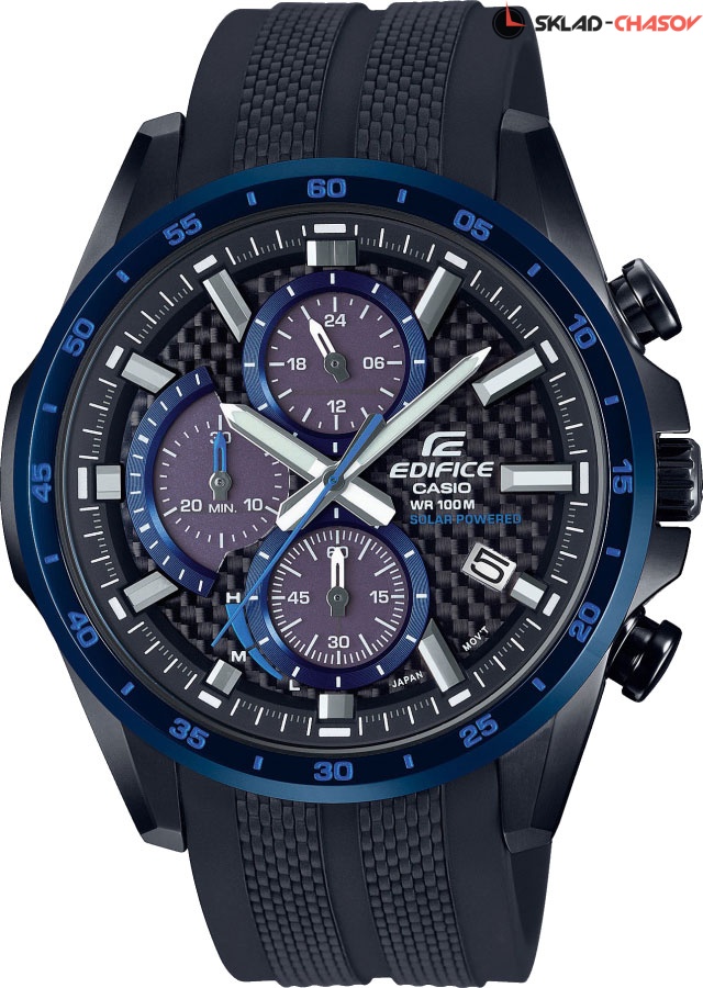 Массивный хронограф придется по душе поклонникам спортивного стиля и стильных аксессуаров. Edifice. Питание от солнечной энергии, индикатор заряда батареи. Необритовое светонакопительное покрытие обеспечивает длительное послесвечение в темноте даже после кратковременного нахождения на свету. Секундомер с точностью показаний 1с и временем измерения 30мин. Заводная головка с защитой. Задняя крышка с винтовым фиксатором.