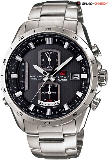 Часы для экстремальных ситуаций – обладают встроенной солнечной батареей, системой корректировки времени и функцией мирового времени. Edifice. Питание от солнечной энергии, индикатор заряда батареи. Светонакопительное покрытие необрит продолжает светиться в темноте даже после непродолжительного пребывания на свету. Функция сохранения энергии. Время работы аккумулятора без подзарядки - 5 месяцев, при включенной функции сохранения энергии - 29 месяцев. Коррекция текущего времени радиосигналом на территории почти всей Европы, США, Японии и Китая. Секундомер с точностью показаний 1/20с и временем измерения 1ч. Измерение прошедшего и промежуточного времени, память на 10 этапов, функция отображения лучшего времени. Мировое время. 12-ти и 24-х часовой формат времени. Звуковой сигнал - в установленное время издается тональный сигнал. Завинчивающаяся заводная головка. Раскладывающаяся застежка, расстегиваемая одним касанием.
