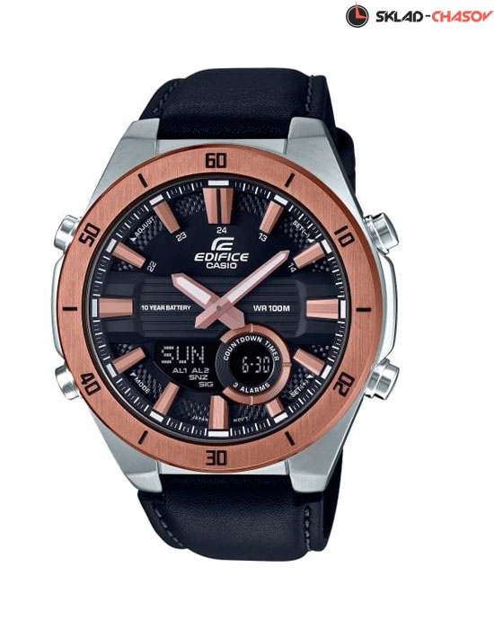 Кварцевые часы. Аналогово-цифровой циферблат. Водостойкость WR 100. Записная книжка на 30 записей. Мировое время 29 часовых зон (30 городов). Секундомер 1/100. Режимы измерения секундомера: прошедшее время, промежуточное время, время 1го-2го места. Таймер обратного отсчета от 1 минуты до 24 часов (1-минутное возрастание, 1-часовое возрастание). 3 будильника (1 с функцией повтора). Ежечасный сигнал. Автоматический календарь (до 2099 года). 12/24х часовой формат времени. Минеральное стекло. Корпус выполнен из нержавеющей стали с частичным IP покрытием. Размеры корпуса 48 мм x 52 мм х 14 мм. Кожаный ремешок. Срок службы батареи: 10 лет.