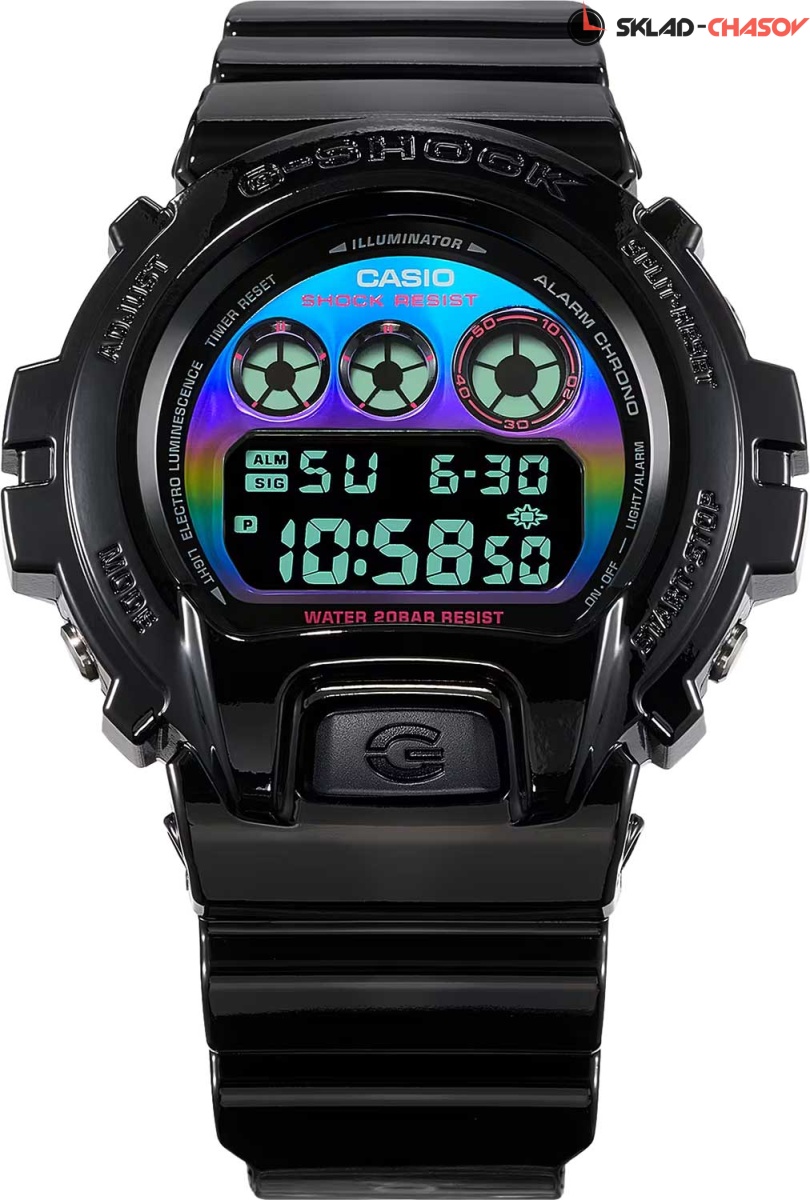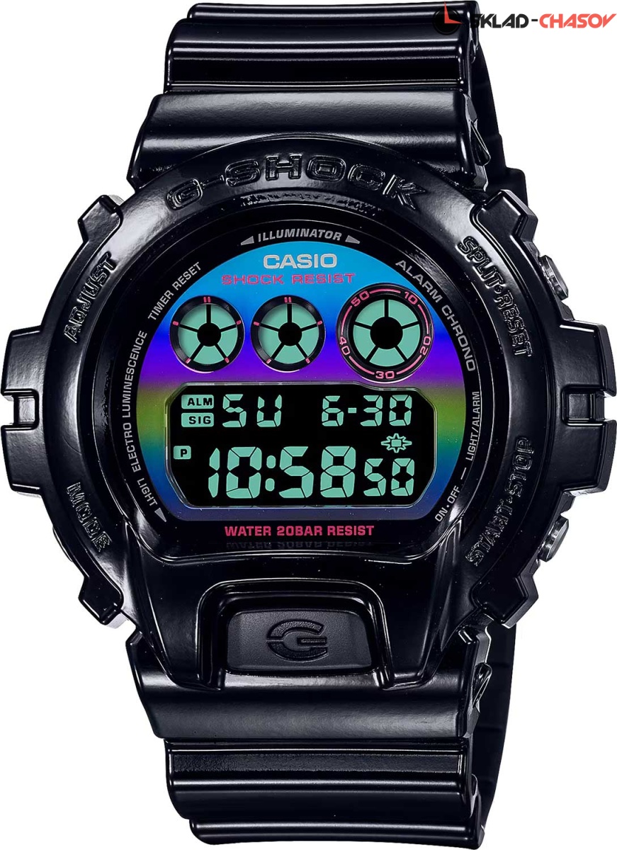 Модный дизайн и широкий функционал - лучшее сочетание для современного мужчины. G-Shock Virtual Rainbow. Мужские часы. Модель вдохновлена киберспортом и виртуальным миром видеоигр. Яркие акценты напоминают цветную подсветку профессиональных геймерских девайсов. Противоударный корпус защищает механизм от ударов и вибрации. Электролюминесцентная подсветка освещает весь циферблат, после отпускания кнопки свечение продолжается еще некоторое время. Цвет подсветки: сине-зеленый. Световая индикация сигнала. 12-ти и 24-х часовой формат времени. Секундомер с двумя точностями показаний: 1/100с (до 1ч) и 1с (после 1ч) и временем измерения 24ч. SPLIT-хронограф. Таймер обратного отсчета от 1с до 24ч с автоповтором. Типы сигналов: ежедневный, ежемесячный, каждый день определенного месяца, на определенную дату. Батарейка рассчитана на 2 года. Стальная задняя крышка крепится на 4-х винтах. Водонепроницаемость 20 Бар в соответствии с ISO 2281. Ремешок из полимерного материала с классической застежкой