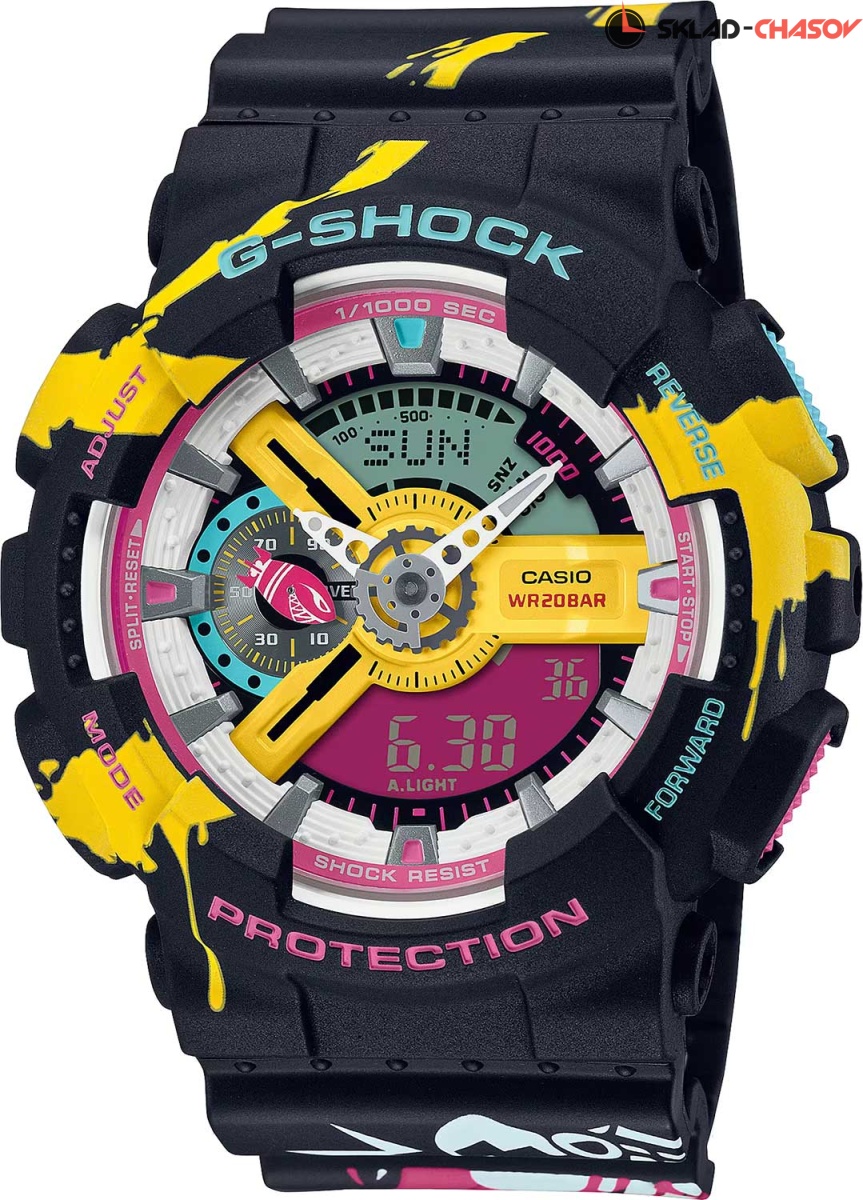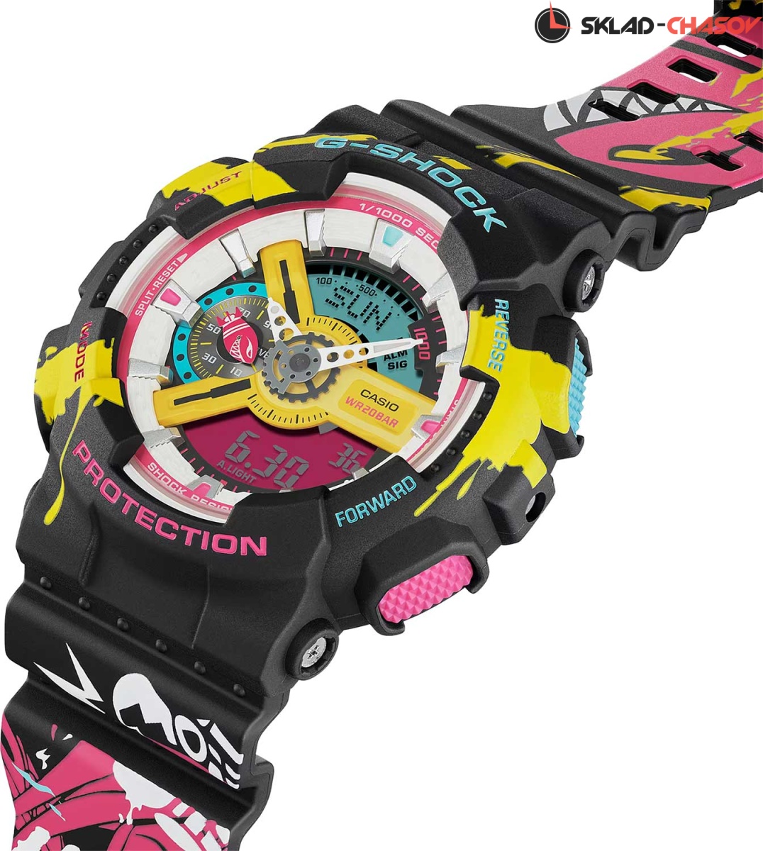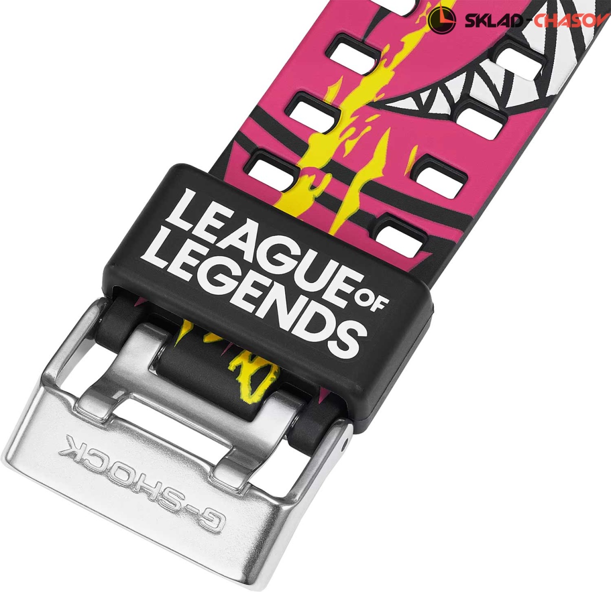 Яркие цвета, запоминающийся дизайн, а также неповторимая ударопрочность - это все часы G-Shock. G-Shock x League of Legends. Модель выпущена в коллаборации с онлайн-игрой League of Legends, которую выпустила компания Riot Games в 2009 году. Цветовая расцветка корпуса и ремешка вдохновлена фирменным оружием - ракетой Super Megadeath. Маленькая стрелка в положении 9 часов выполнена в форме ракеты Джинкса. Противоударный корпус защищает механизм от ударов и вибрации. Защищены от магнитных полей. Светодиодная автоподсветка - при повороте часов в сторону лица подсветка дисплея осуществляется автоматически. Настраиваемое послесвечение 1,5 или 3сек. Цвет подсветки: оранжевый. Необритовое светонакопительное покрытие обеспечивает длительное послесвечение в темноте даже после кратковременного нахождения на свету. 12-ти и 24-х часовой формат времени. Секундомер с точностью показаний 1/1000с и временем измерения 100ч. Расчет скорости по выбранной дистанции. SPLIT-хронограф. Таймер обратного отсчета от 1мин до 24ч с автоповтором. Мировое время – 48 городов (29 часовых поясов), всемирное координированное время (UTC). Функция включения/отключения летнего времени. Переключение между домашним и мировым временем. Батарея рассчитана на 2 года. Стальная задняя крышка крепится на 4-х винтах. Ремешок из полимерного материала с классической застежкой. Подарочная упаковка.