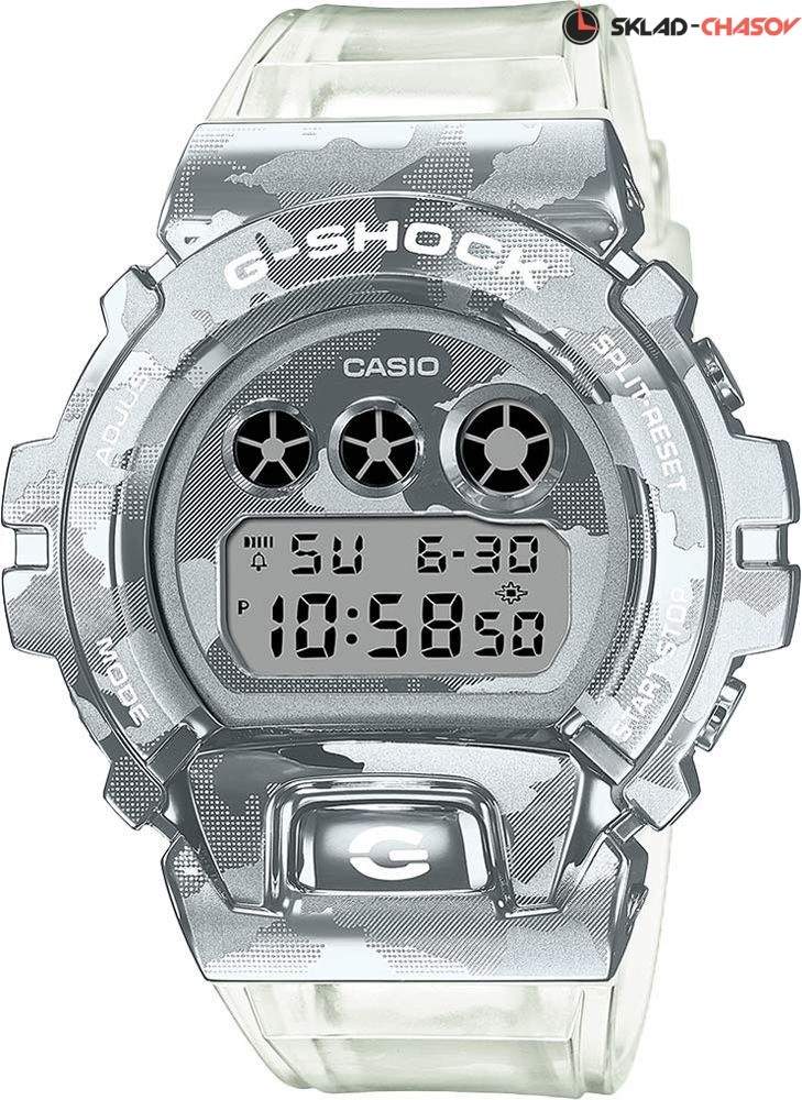 Casio G-Shock DW-6900 в новом стальном обличии. Корпус часов выполнен из полимера, укрепленного карбоновыми волокнами, поверх которого наложена литая стальная накладка. Камуфляжный рисунок нанесен путем лазерной гравировки. Благодаря подобной структуре, часы обладают великолепным внешним видом и абсолютной ударопрочностью, ставшей визитной карточкой коллекции. Электролюминесцентная подсветка освещает весь циферблат, после отпускания кнопки свечение продолжается еще некоторое время. Цвет подсветки: сине-зеленый. Световая индикация сигнала. Секундомер с двумя точностями показаний: 1/100 сек. (до 1 часа) и 1 сек. (после 1 часа) и временем измерения 24 часа, сплит-хронограф. Таймер обратного отсчета от 1 минуты до 24 часов с автоповтором. 12-ти и 24-х часовой формат времени. Типы сигналов: ежедневный, ежемесячный, каждый день определенного месяца, на определенную дату. Автоматический календарь до 2099 года. Ремешок из полимерного материала. Вес 96 грамм. Гарантия 2 года.