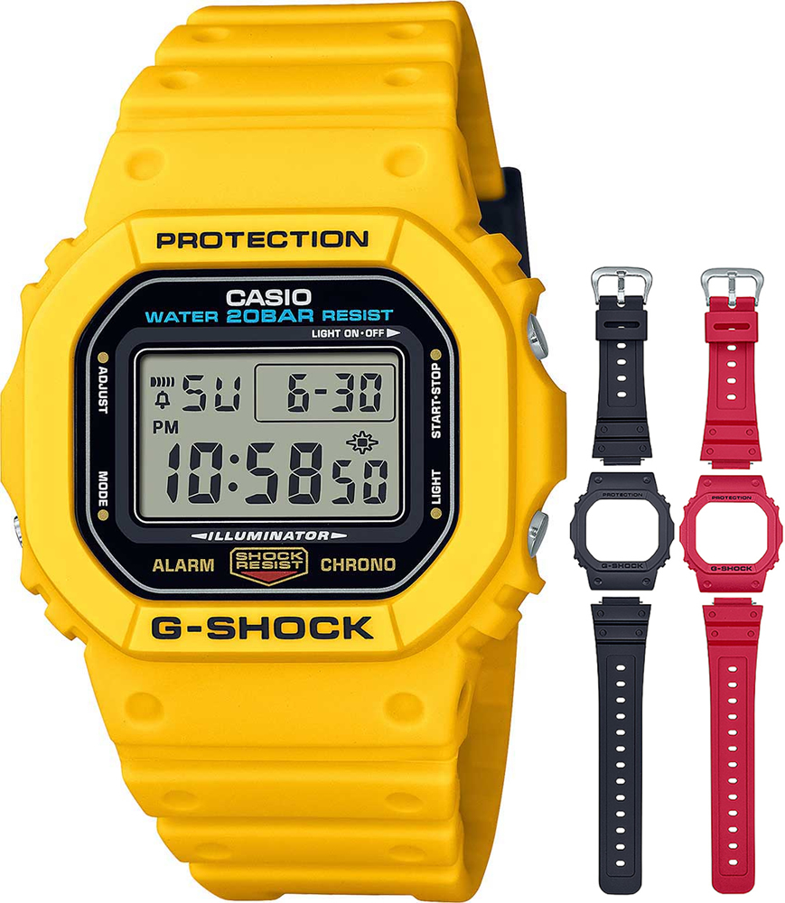 Яркие спортивные часы Casio G-Shock. Модель часов создана на базе DW-5600. Противоударный корпус защищает механизм от ударов и вибрации. Электролюминесцентная подсветка освещает весь циферблат. После отпускания кнопки, свечение продолжается еще некоторое время. Световая индикация сигнала. Цвет подсветки: сине-зеленый. 12-ти и 24-х часовой формат времени. Секундомер с двумя точностями показаний: 1/100 сек. (до 1 часа) и 1 сек. (после 1 часа) и временем измерения 24 ч. SPLIT-хронограф. Таймер обратного отсчета от 1 сек. до 24 ч. с автоповтором. Типы сигналов: ежедневный, ежемесячный, каждый день определенного месяца, на определенную дату. Ремешок из полимерного материала с классической застежкой. В комплекте 2 сменных ремешка и 2 безеля, которые позволяют создавать 27 различных комбинаций цветовых расцветок. Вес всего 52 грамма.Гарантия 2 года.