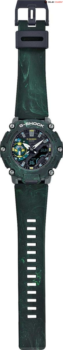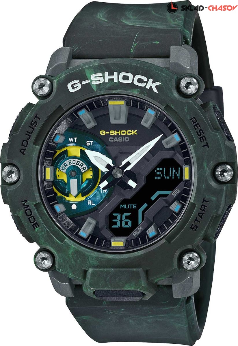 Cпортивные мужские часы Casio G-Shock Mystic Forest с расцветкой вдохновленной лесом. Часы из серии Carbon Core Guard. Крупный противоударный пластиковый корпус с карбоновыми волокнами более прочный и, в то же время, более легкий. Этот же материал защищает внутренний модуль от повреждений и деформаций при ударах. Массивные винты на безеле подчеркивают брутальный облик и обеспечивают дополнительную фиксацию. Двойная светодиодная подсветка позволяет видеть в полной темноте не только аналоговый циферблат, но и цифровой дисплей. Необритовое светонакопительное покрытие обеспечивает длительное послесвечение в темноте даже после кратковременного нахождения на свету. Дополнительный циферблат отображения режимов в положении 9 часов. Мировое время. 12-ти и 24-х часовой формат времени. Секундомер с точностью показаний 1/100 сек. и временем измерения 24 часа, сплит-хронограф. Таймер обратного отсчета от 1/1 мин. до 24 часов с автоповтором. Функция перемещения стрелок. Функция отключения/включения звука. 5 будильников. Автоматический календарь до 2099 года. Новая конструкция кнопок позволила избавиться от массивной защиты вокруг них и увеличить размер кнопок для более удобного управления. Задняя крышка из нержавеющей стали с креплением к корпусу на 4-х винтах. Ремешок из полимерного материала с классической застежкой. Срок службы элемента питания около 3-х лет. Вес часов 57 грамм.Гарантия 2 года.