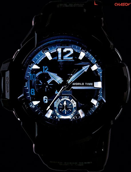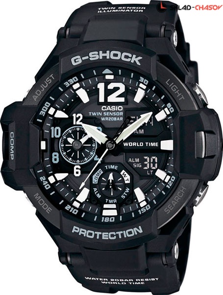 Новые массивные часы G-Shock с компасом, датчиком температуры и яркой светодиодной подсветкой. Aviation Gravitymaster. Противоударный корпус защищает механизм от ударов и вибрации. Светодиодная автоматическая супер-подсветка. При движении руки дисплей освещается ярким светом. Светонакопительное покрытие необрит продолжает светиться в темноте даже после непродолжительного пребывания на свету. Встроенный цифровой компас. Диапазон измерения от 0° до 359° с точностью 1°. Коррекция магнитного склонения. Встроенный датчик температуры от -10° до +60°С с точностью 0,1°C. Мировое время – 48 городов (31 часовой пояс), всемирное координированное время (UTC). Функция включения/отключения летнего времени. 12-ти и 24-х часовой формат времени. Секундомер с точностью показаний 1/100с и временем измерения 1ч. Сплит-хронограф. Таймер обратного отсчета от 1мин до 1ч. Функция перемещения стрелок. Функция включения/отключения звука. Стальной безель.