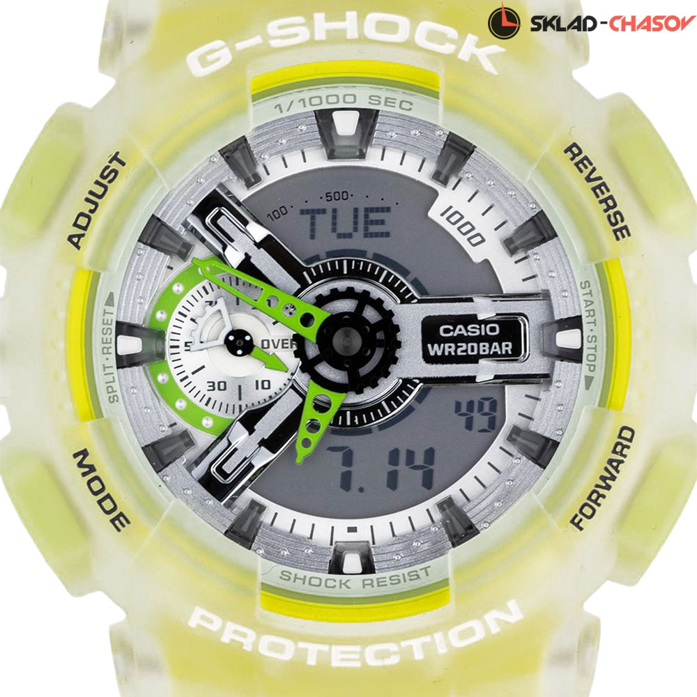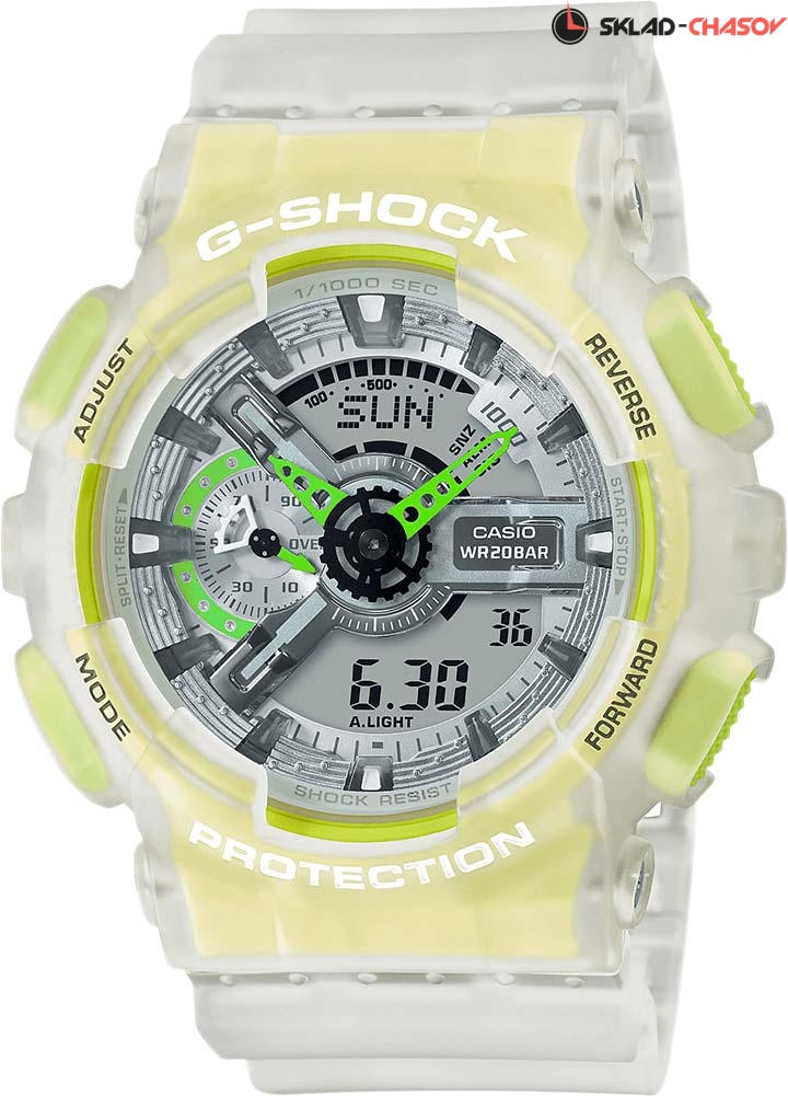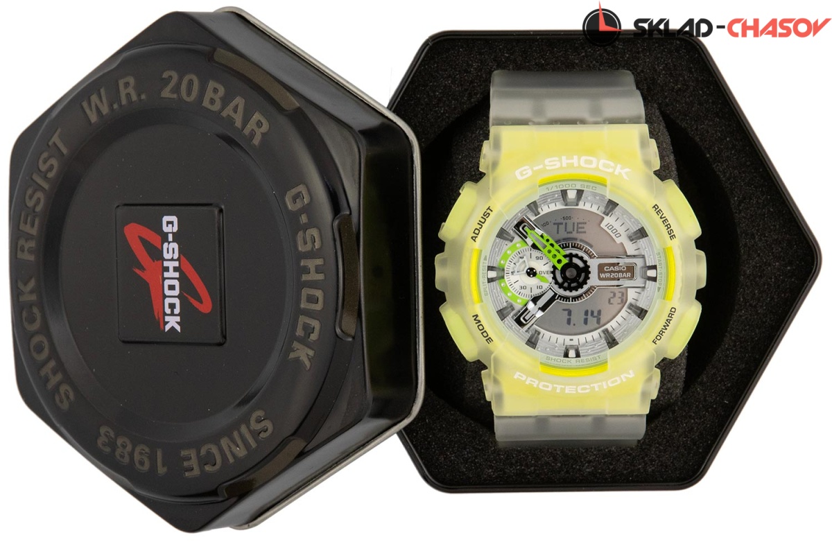 Стильный аксессуар от Casio с прозрачным корпусом отлично впишется в ваш летний образ. G-Shock. Новинка в серии часов GA-110 выполнена из пластика флуоресцентного цвета, который идеально сочетается с летней одеждой. Противоударный корпус защищает механизм от ударов и вибрации. Защищены от магнитных полей. Циферблат подсвечивается светодиодом, функция автоподсветки освещает циферблат при повороте часов к лицу. Цвет подсветки: оранжевый. 12-ти и 24-х часовой формат времени. Секундомер с точностью показаний 1/1000с и временем измерения 100ч. Измерение скорости. SPLIT-хронограф. Таймер обратного отсчета от 1мин до 24ч с автоповтором. Мировое время – 48 городов (29 часовых поясов), всемирное координированное время (UTC). Автоматический переход на зимнее и летнее время, возможность включения/отключения данной функции. Ремешок с классической застежкой.