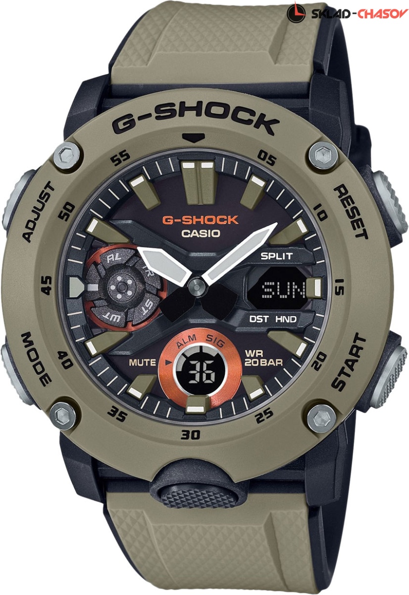Ударопрочные часы цвета хаки для любителей активного образа жизни. G-Shock Carbon Core Guard. Новая серия часов со структурой Carbon Core Guard. Противоударный пластиковый корпус с карбоновыми волокнами более прочный и в то же время более легкий. Этот же материал защищает внутренний модуль от повреждений и деформаций при ударах. Улучшена ударопрочность конструкции кнопок, что устраняет необходимость во внешних защитных накладках. Многокомпонентный циферблат состоит из цифровых окошек указателей числа и дня недели, а также индикатора режима работы часов, который расположен в позиции 9 часов и выполнен в виде пропеллера. Светодиодная подсветка включается большой кнопкой расположенной в нижней части корпуса. Цвет подсветки: белый. Мировое время – 48 городов (31 часовой пояс). Функция включения/отключения летнего времени. 12-ти и 24-х часовой формат времени. Секундомер с точностью показаний 1/100с и временем измерения 24ч. Расчет скорости по выбранной дистанции. Сплит-хронограф. Таймер обратного отсчета от 1/1мин до 24ч с автоповтором. Функция перемещения стрелок. Функция отключения/включения звука. Двойная задняя крышка: стальная закрывает механизм, а поверх неё закреплена пластина из пластика. Благодаря этой накладке у этой модели появилась функция быстрой смены ремешка.