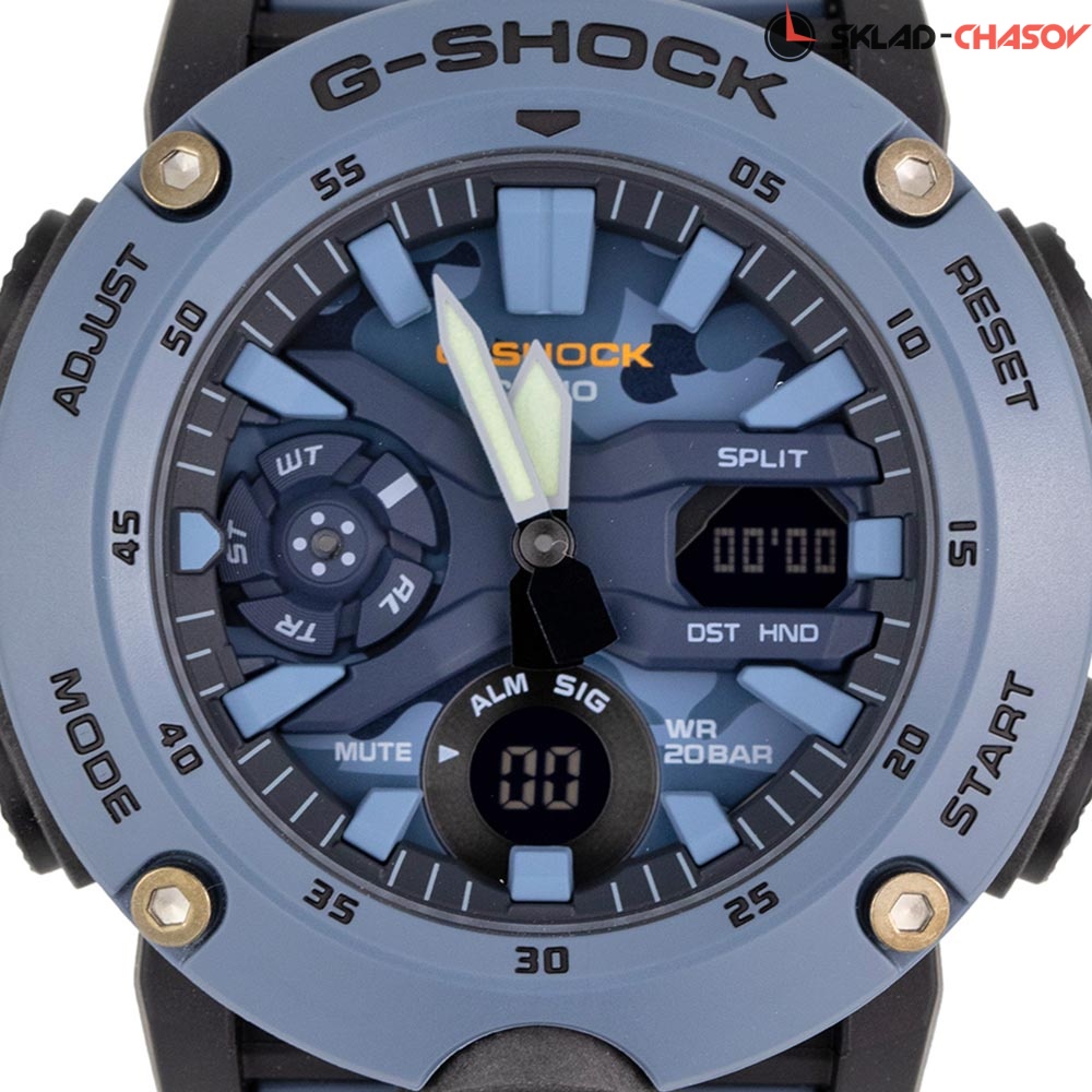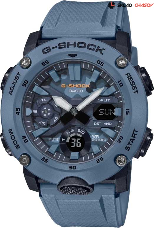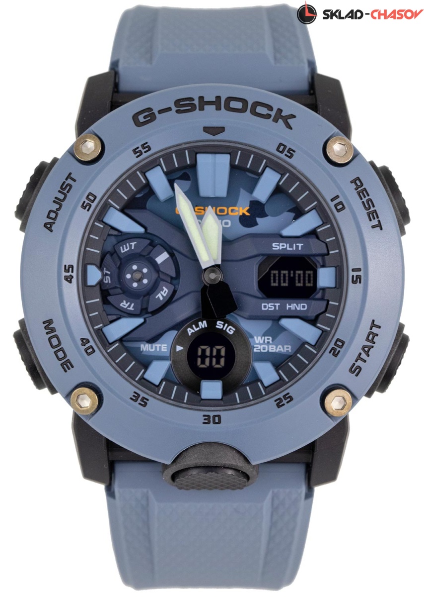 Стильные ударопрочные часы цвета джинсовой ткани станут отличным дополнением к casual образу на каждый день. G-Shock. Противоударный пластиковый корпус с карбоновыми волокнами более прочный и в то же время более легкий. Этот же материал защищает внутренний модуль от повреждений и деформаций при ударах. Двойная подcветка: лицо и циферблат подсвечиваются светодиодом, благодаря наличию функции задержки, после отпускания кнопки освещение горит еще несколько секунд. Светодиодная подсветка включается большой кнопкой расположенной в нижней части корпуса. Цвет подсветки: белый. Многокомпонентный циферблат состоит из цифровых окошек указателей числа и дня недели, а также индикатора режима работы часов, который расположен в позиции 9 часов. Мировое время – 48 городов (31 часовой пояс), всемирное координированное время (UTC). Функция включения/отключения летнего времени. 12-ти и 24-х часовой формат времени. Секундомер с точностью показаний 1/100с и временем измерения 24ч. SPLIT-хронограф. Таймер обратного отсчета от 1/1мин до 24ч с автоповтором. Функция перемещения стрелок для беспрепятственного просмотра информации на цифровых дисплеях. Функция отключения/включения звука. Ремешок из полимерного материала.