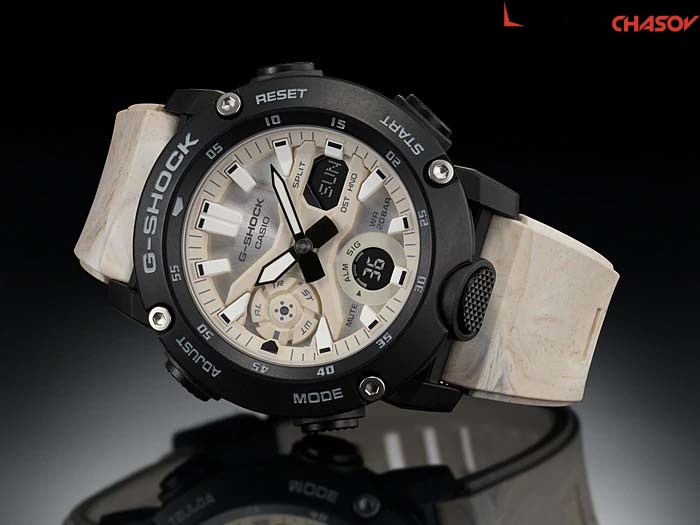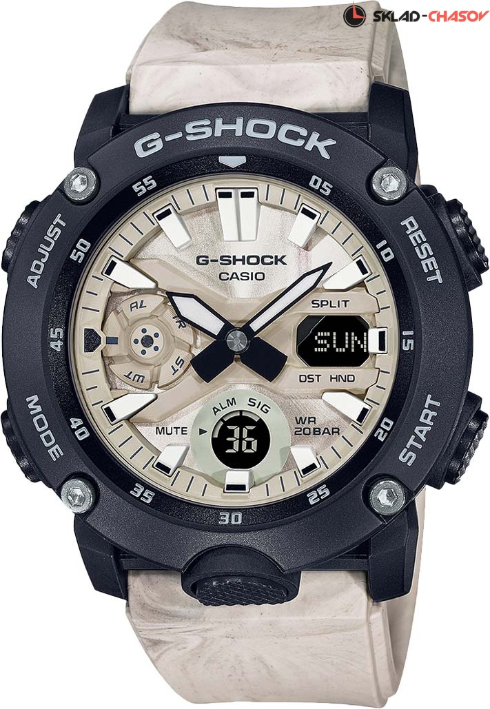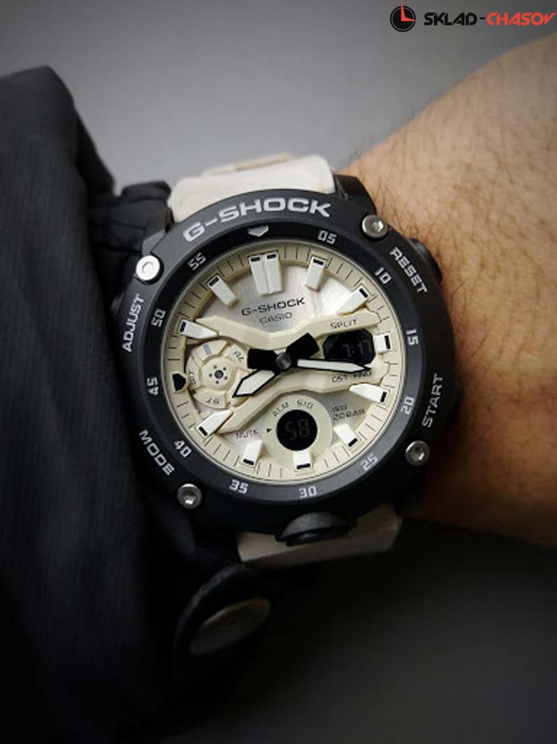 Стильные ударопрочные часы станут отличным дополнением к casual образу на каждый день. G-Shock. Новая серия часов со структурой Carbon Core Guard. Противоударный пластиковый корпус с карбоновыми волокнами более прочный и в то же время более легкий. Этот же материал защищает внутренний модуль от повреждений и деформаций при ударах. Двойная подcветка: лицо и циферблат подсвечиваются светодиодом, благодаря наличию функции задержки, после отпускания кнопки освещение горит еще несколько секунд. Светодиодная подсветка включается большой кнопкой расположенной в нижней части корпуса. Цвет подсветки: белый. Необритовое светонакопительное покрытие обеспечивает длительное послесвечение в темноте даже после кратковременного нахождения на свету. Многокомпонентный циферблат состоит из цифровых окошек указателей числа и дня недели, а также индикатора режима работы часов, который расположен в позиции 9 часов. 12-ти и 24-х часовой формат времени. Секундомер с точностью показаний 1/100с и временем измерения 24ч. SPLIT-хронограф. Таймер обратного отсчета от 1/1мин до 24ч с автоповтором. Мировое время – 48 городов (31 часовой пояс), всемирное координированное время (UTC). Функции включения/отключения летнего времени, отключения/включения звука и перемещения стрелок для беспрепятственного просмотра информации на цифровых дисплеях. Ремешок из полимерного материала с классической застежкой.