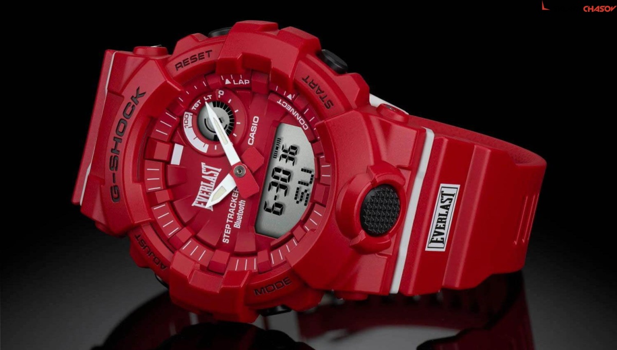Часы G-Shock с трекером активности подойдут как для обычного лайфстайла, будучи ярким и крутым аксессуаром, так и для ежедневных тренировок или пробежек. Everlast x G-Shock. Лимитированная серия. Модель выпущена совместно с компанией Everlast, которая специализируется на производстве снаряжения для бокса и фитнеса. При активизации подсветки появляется надпись «Choice Of Champions» (Выбор Чемпионов), которая является философией компании Everlast. Новые часы созданы на базе GBA-800. Модели этой серии оснащены многосегментными цифровыми дисплеями для улучшения читаемости. Цифровой дисплей расположен в нижней секции, в правом верхнем углу находится цифровой диск. Каждая область отображения показывает различные измерения, хронометраж и другую информацию, которая предоставляет полезные данные о вашей повседневной деятельности. Противоударный корпус защищает механизм от ударов и вибрации. Светодиодная автоподсветка - при повороте часов в сторону лица подсветка дисплея осуществляется автоматически. Цвет подсветки: белый. 3-осевой акселерометр автоматически начинает отсчет шагов на дисплее, когда вы начинаете бегать или участвовать в других действиях во время ношения часов. Шагомер измеряет количество шагов от 0 до 999999. Графическое отображение пройденных шагов за последние 11ч. Установка цели в диапазоне от 1000 до 50 000. Звуковое напоминание об отсутствии активности и достижении цели. Беспроводная технология Bluetooth® 4.0 со сверхнизким потреблением энергии для синхронизации со смартфоном. Приложение G-SHOCK Connected Phone позволяет настроить параметры для журнала счетчика шагов с пятью уровнями интенсивности упражнений, рассчитать сожженные калории и шаги. При подключении к смартфону часы корректируют текущее время 4 раза в день, а также копируют настройки мирового времени. Мировое время – 300 городов. Одновременное отображение текущего времени в двух разных часовых поясах. 12-ти и 24-х часовой формат времени. Секундомер с двумя точностями показаний: 1/100с (до 1ч) и 1с (после 1ч) и временем измерения 24ч. Память на 200 этапов (дата, время, время круга). Сплит-хронограф. Таймер обратного отсчета от 1мин до 1ч с автоповтором. Количество повторений таймера устанавливается от 1 до 20. Функция перемещения стрелок для беспрепятственного просмотра информации на цифровых дисплеях. Функция отключения/включения звука.
