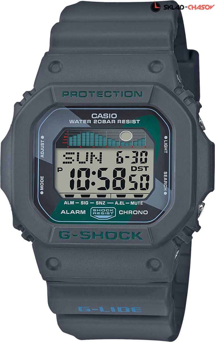 Винтажная модель в новой цветовой гамме корпуса и ремешка понравится поклонникам серфинга. G-Shock. Модель часов создана на базе GLX-5600. Противоударный корпус защищает механизм от ударов и вибрации. Сине-зеленая электролюминесцентная с автоподсветкой обеспечивает освещение всего циферблата, при наклоне часов в сторону лица для считывания функция автоподсветки обеспечивает автоматическое включение. Отображение возраста и фазы Луны. Графическое отображение сведений о приливах и отливах на заданную дату и время. Секундомер с точностью показаний 1/100с и временем измерения 24ч. Сплит-хронограф. Таймер обратного отсчета от 1мин до 24ч с автоповтором. Мировое время – 48 городов (29 часовых поясов). Функция включения/отключения летнего времени. Яхт-таймер - после каждой пройденной минуты издается звуковой сигнал, в течении последних 10 секунд сигнал издается каждую секунду. 12-ти и 24-х часовой формат времени. Типы сигналов: ежедневный, ежемесячный, каждый день определенного месяца, на определенную дату. Функция включения/отключения звука. Световая индикация сигнала. Имеется женский вариант модели BLX-560VH-1ER.