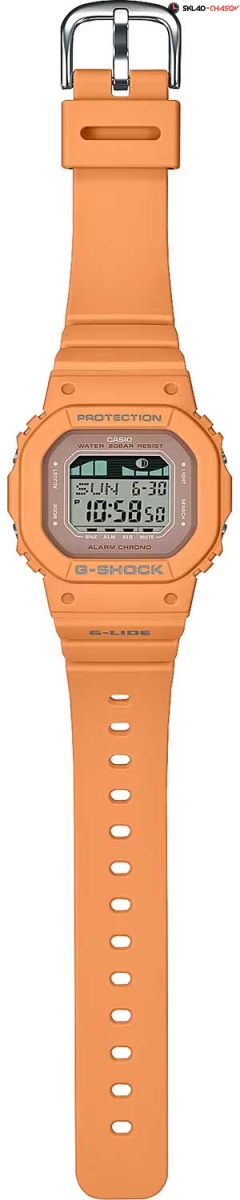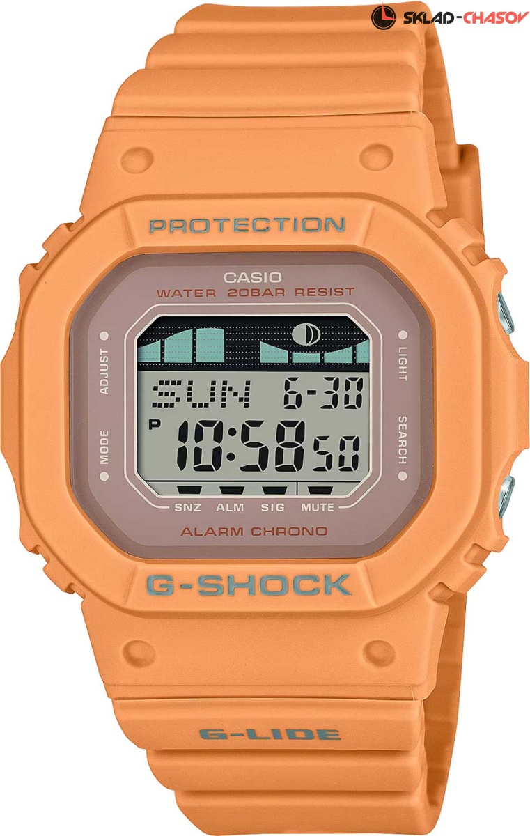 Функциональную новинку от Casio оценит любая поклонники серфинга. G-Lide. Унисекс часы. Корпус и ремешок выполнены из биопластика, который изготавливается из возобновляемых органических ресурсов. Противоударный корпус защищает механизм от ударов и вибрации. Электролюминесцентная автоподсветка обеспечивает освещение всего циферблата, при наклоне часов в сторону лица для считывания функция автоподсветки обеспечивает автоматическое включение. Настраиваемое послесвечение 1,5 или 3сек. Цвет подсветки: белый. Световая индикация сигнала. Типы сигналов: ежедневный, ежемесячный, каждый день определенного месяца, на определенную дату. Функция включения/отключения звука. Отображение возраста и фазы Луны. Графическое отображение сведений о приливах и отливах на заданную дату и время. 12-ти и 24-х часовой формат времени. Секундомер с точностью показаний 1/100с и временем измерения 24ч. SPLIT-хронограф. Таймер обратного отсчета от 1мин до 24ч с автоповтором. Мировое время – 48 городов (29 часовых поясов). Функция включения/отключения летнего времени. Батарея рассчитана на 3 года. Стальная задняя крышка крепится на 4-х винтах. Водонепроницаемость в соответствии с ISO 2281. Ремешок с классической застежкой.