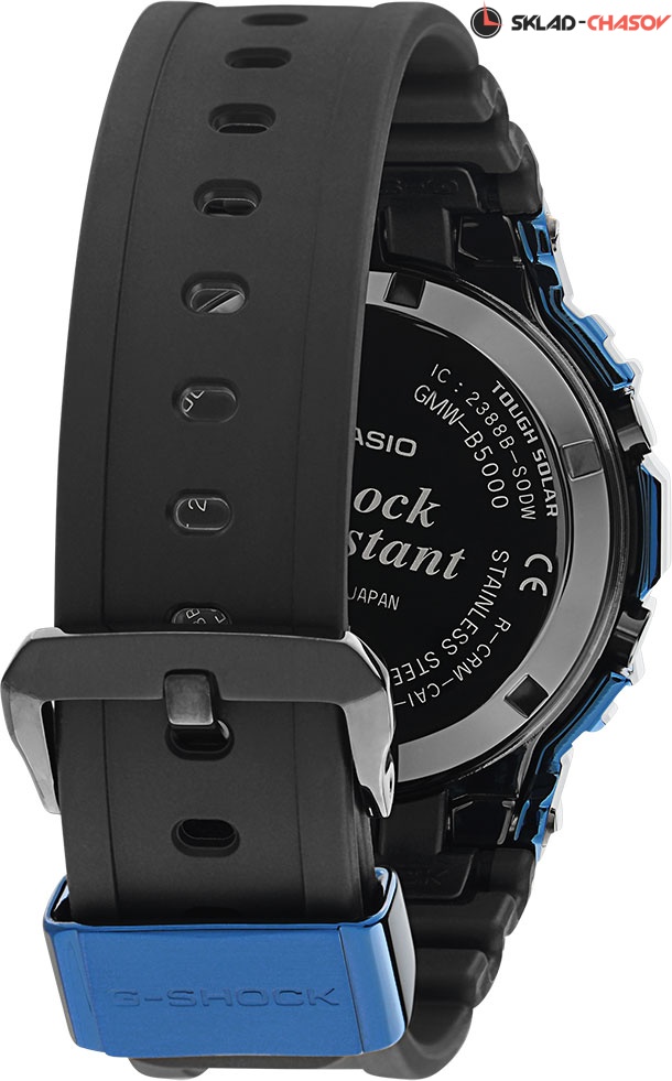 Перед вами лимитированное дополнение к наделавшему много шума, релизу Baselworld 2018 от Casio. Впервые за свою историю легендарный олдскульный корпус GMW-B5000 облачили в сталь. G-Shock Standard Digital. Часы с узнаваемым корпусом прямоугольной формы и дисплеем STN-LCD, который обеспечивает простоту считывания информации даже под углом. Внешний стальной корпус с синим износостойким ионным напылением, на безеле сохранена стальная текстура. Задняя крышка защищена сверхпрочным черным DLC-покрытием. Питание от солнечной энергии Tough Solar - солнечные батарейки большой мощности, индикатор уровня заряда батареи (до 7 уровней). Функция автоматического сохранения энергии. Время работы аккумулятора без подзарядки до 10 месяцев, при включенной функции сохранения энергии до 22 месяцев. 4 трубки из нержавеющей стали образуют металлический каркас, который надежно соединяет лицевую и заднюю часть корпуса с заключенным в него механизмом часов. Таким образом, противоударный корпус защищает механизм от ударов и вибрации. Циферблат подсвечиваются ярким светодиодом, при недостаточном освещении во время поворота запястья в сторону лица подсветка включается автоматически. Модуль часов рассчитан на работу при низких температурах до -10°С/14°F. Технология Multi Band 6 позволяет принимать сигналы от шести радиовышек, расположенных в различных точках земного шара, которые передают временные сигналы от определенных атомных часов. Коррекция текущего времени радиосигналом на территории почти всей Европы, США, Японии и Китая. Отображение дней недели на шести языках, включая русский. Мировое время – 39 городов (39 часовых поясов), всемирное координированное время (UTC). Автоматический переход на зимнее и летнее время, возможность включения/отключения данной функции. 12-ти и 24-х часовой формат времени. Секундомер с двумя точностями показаний: 1/100с (до 1ч) и 1с (после 1ч) и временем измерения 24ч. Сплит-хронограф. Таймер обратного отсчета от 1мин до 24ч. Функция включения/отключения звука. Авиарежим - часы переключаются в режим оффлайн нажатием кнопки. Синхронизация со смартфоном по Bluetooth®. При подключении часов к смартфону: автоматическая корректировка текущего времени, установка времени для 300 городов, переключение между домашним и мировым временем, летнее время, настройка таймера, будильника, напоминаний. Вибро уведомление и световая индикация о событии созданном в приложении. Функция поиска телефона. Завинчивающаяся задняя крышка.