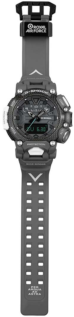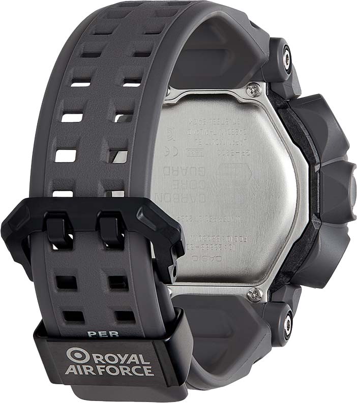 Эти часы станут незаменимым помощником для любителей спорта и активного отдыха! Новинка в серии часов Gravitymaster создана совместно с Royal Air Force (Королевские воздушно-военные силы), которые являются старейшими ВВС мира. Цветовая гамма напоминает самолет-невидимку, а белый и зеленый цвета создают образ стекла кабины. На ремешке напечатан девиз RAF на латыни. Противоударный корпус защищает механизм от ударов и вибрации. Ударопрочная конструкция Carbon Core Guard объединяет корпус и заднюю крышку в единый карбоновый моноблок. Двойная подcветка: лицо и циферблат подсвечиваются ярким светодиодом при недостаточном освещении, во время поворота запястья подсветка включается автоматически. Цвет подсветки: белый. Необритовое светонакопительное покрытие обеспечивает длительное послесвечение в темноте даже после кратковременного нахождения на свету. 12-ти и 24-х часовой формат времени. Секундомер с двумя точностями показаний: 1/100с (до 1ч) и 1с (после 1ч) и временем измерения 24ч. SPLIT-хронограф. Таймер обратного отсчета от 1с до 24ч. Мировое время – 38 городов (38 часовых поясов), всемирное координированное время (UTC). Автоматический переход на зимнее и летнее время, возможность включения/отключения данной функции. Время восхода и захода Солнца. 3-осевой акселерометр автоматически начинает отсчет шагов на дисплее, когда вы начинаете бегать или участвовать в других действиях во время ношения часов. Шагомер измеряет количество шагов от 0 до 999999. Термометр от -10° до +60°С с точностью 0,1°C. Барометр - измерение атмосферного давления от 260 до 1100 гПа (от 195 до 825 мм рт. ст.). Встроенный цифровой компас. Диапазон измерения от 0° до 359° с точностью 1°. Высотомер - встроенный датчик барометрического давления с возможностью вывода результатов в единицах высоты над уровнем моря (от -700 до 10000 метров). График набора высоты. Беспроводная технология Bluetooth® 4.0 со сверхнизким потреблением энергии для синхронизации со смартфоном. При подключении к смартфону часы корректируют текущее время, настройки мирового времени, таймера и будильника. Приложение G-SHOCK Connected Phone позволяет настроить параметры для журнала счетчика шагов с пятью уровнями интенсивности упражнений, рассчитать сожженные калории и шаги. При подключении к смартфону часы корректируют текущее время 4 раза в день, а также копируют настройки мирового времени. Авиарежим позволяет отключить Bluetooth-приемник на время перелета. Функции перемещения стрелок для беспрепятственного просмотра информации на цифровых дисплеях, включения/отключения звука и поиска телефона. Карбоновый безель. Ремешок из полимерного материала с классической застежкой.