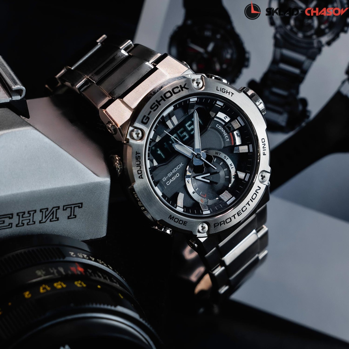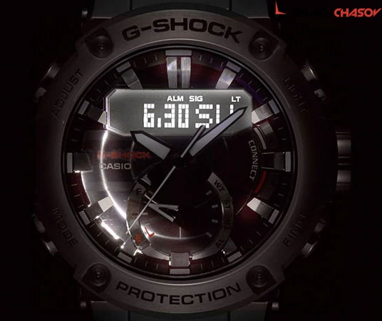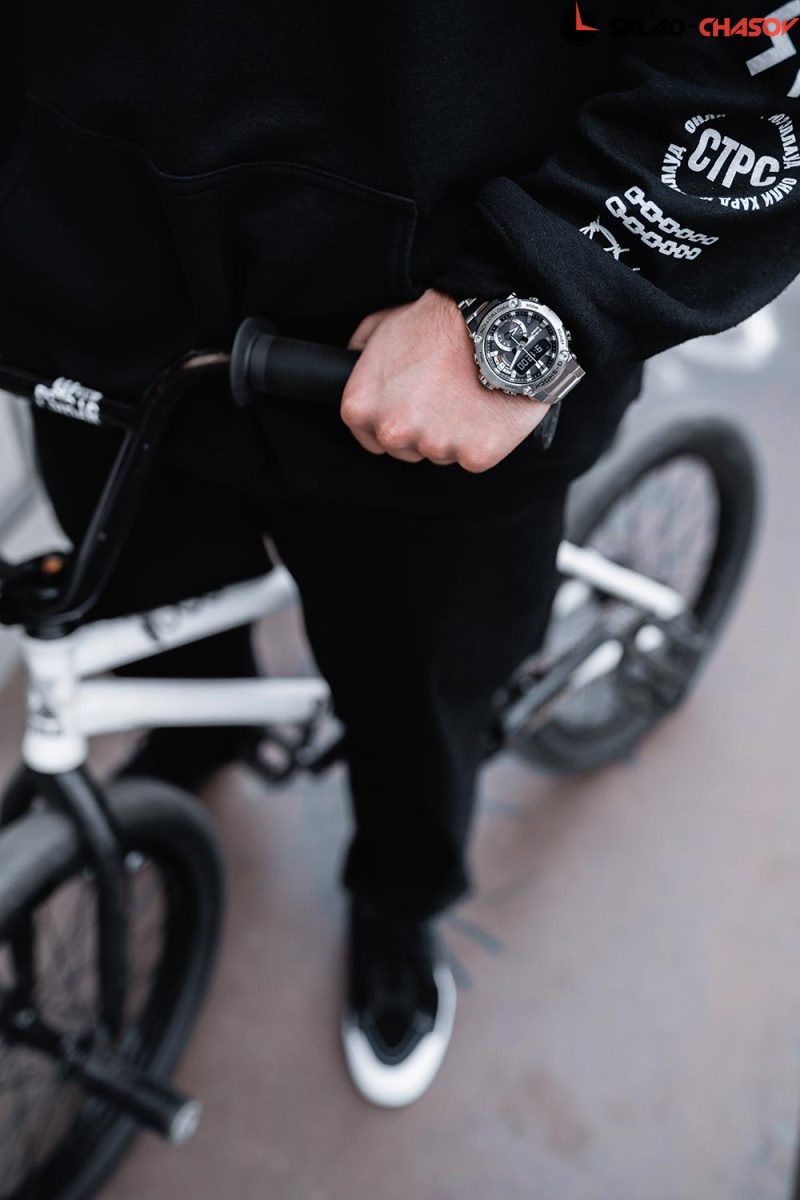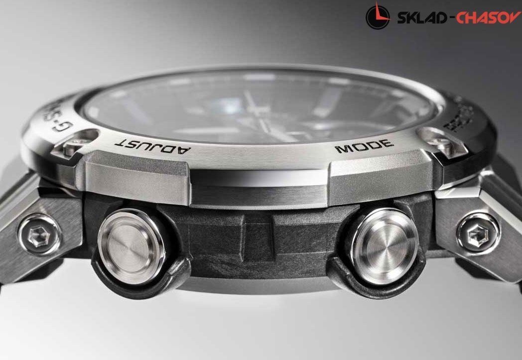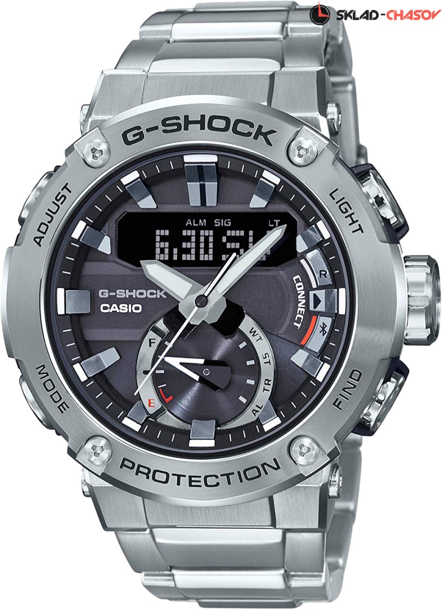 Точность этих противоударных часов оценят пунктуальные мужчины, которые живут активной жизнью. G-Steel. Питание от солнечной энергии Tough Solar - солнечные батарейки большой мощности, индикатор заряда батареи. Функция автоматического сохранения энергии. Время работы аккумулятора без подзарядки приблизительно 6 месяцев, при включенной функции сохранения энергии приблизительно 20 месяцев. Противоударный корпус защищает механизм от ударов и вибрации. Ударопрочная конструкция Carbon Core Guard объединяет корпус и заднюю крышку в единый карбоновый моноблок. Двойная подcветка: лицо и циферблат подсвечиваются ярким светодиодом при недостаточном освещении, во время поворота запястья подсветка включается автоматически. Цвет подсветки: белый. Необритовое светонакопительное покрытие обеспечивает длительное послесвечение в темноте даже после кратковременного нахождения на свету. Беспроводная технология Bluetooth® 4.0 со сверхнизким потреблением энергии для синхронизации со смартфоном. Автоматическое подключение к серверу времени через смартфон для корректировки текущего и настроек мирового времени (до 300 городов). Мировое время – 39 городов (39 часовых поясов), всемирное координированное время (UTC). Автоматический переход на зимнее и летнее время, возможность включения/отключения данной функции. Функция поиска телефона. 12-ти и 24-х часовой формат времени. Секундомер с точностью показаний 1/1000с и временем измерения 24ч. Сплит-хронограф. Таймер обратного отсчета от 1мин до 24ч. Функция перемещения стрелок для беспрепятственного просмотра информации на дисплее. Функция отключения/включения звука. Стальной безель. Раскладывающаяся застежка, расстегиваемая одним касанием.