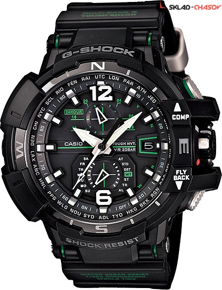 Покупая эти часы - вы покупаете уникальные технологии, авиационный дизайн и непревзойденное японское качество. Aviation Gravitymaster. Питание от солнечной энергии Tough Solar - солнечные батарейки большой мощности, индикатор низкого заряда батареи. Функция автоматического сохранения энергии. Время работы аккумулятора без подзарядки до 6 месяцев, при включенной функции сохранения энергии до 22 месяцев. Противоударный корпус защищает механизм от ударов и вибрации. Тройная защита от воздействия гравитационной, центробежной и вибрационной сил. Модуль часового механизма покрыт виброустойчивым альфа-гелем, уменьшающим вибрацию. Светонакопительное покрытие необрит продолжает светиться в темноте даже после непродолжительного пребывания на свету. Технология Multi Band 6 позволяет принимать сигналы от шести радиовышек, расположенных в различных точках земного шара, которые передают временные сигналы от определенных атомных часов. Коррекция текущего времени радиосигналом на территории почти всей Европы, США, Японии и Китая. Функция автоматической коррекции положения стрелок проверяет положение стрелок каждый час и корректирует его в случае необходимости. Встроенный цифровой компас. Диапазон измерения от 0° до 359° с точностью 1°. Коррекция магнитного склонения. Мировое время – 29 городов (29 часовых поясов), всемирное координированное время (UTC). Автоматический переход на зимнее и летнее время, возможность включения/отключения данной функции. 12-ти и 24-х часовой формат времени. Система Smart Access с помощью электронной заводной головки обеспечивает простой и удобный доступ ко всем важным функциям часов. Нажатие или поворот заводной головки позволяет переключаться между различными режимами и активировать будильник, таймер, секундомер, а также настраивать функцию мирового времени. Секундомер с точностью показаний 1/20с и временем измерения 2ч. Таймер обратного отсчета от 1мин до 1ч. Звуковой сигнал - в установленное время издается тональный сигнал. Заводная головка с защитой.
