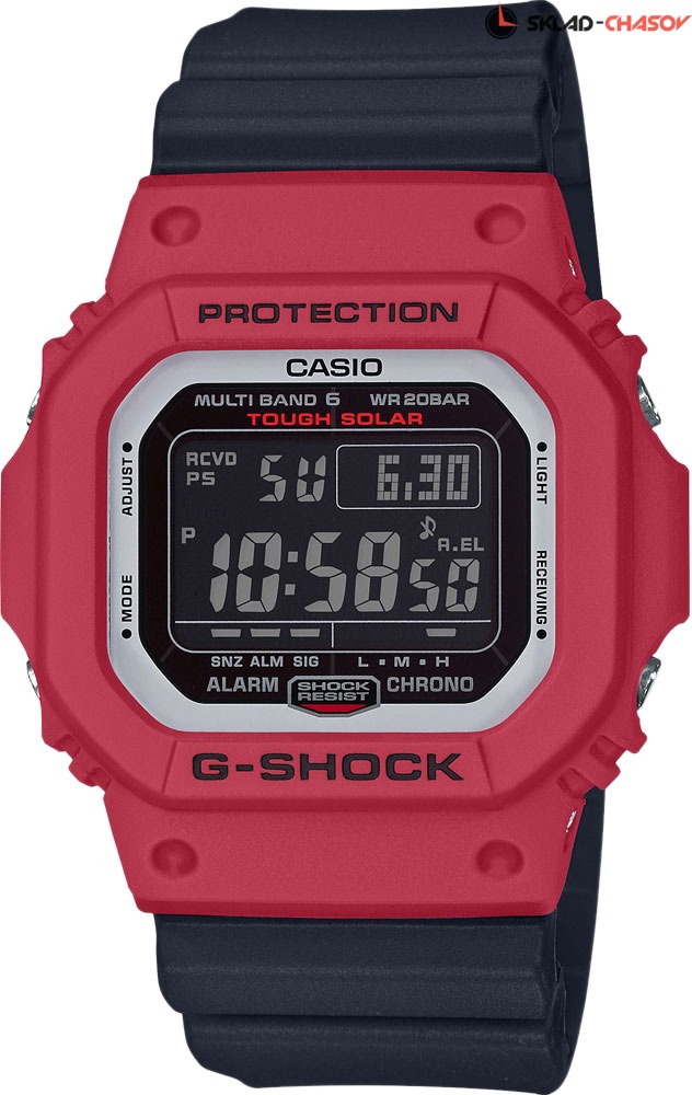 Каждая модель часов G-Shock придерживается установленного эталона прочности - эти часы не исключение. G-Classic. Новый вариант модной расцветки модели GW-M5610, в ней красный корпус идеально дополняет черный ремешок. Питание от солнечной энергии Tough Solar - солнечные батарейки большой мощности, индикатор заряда батареи. Функция автоматического сохранения энергии (отключает LCD дисплей). Время работы аккумулятора без подзарядки - 10 месяцев, при включенной функции сохранения энергии - 26 месяцев. Противоударный корпус защищает механизм от ударов и вибрации. Электролюминесцентная подсветка освещает весь циферблат. Подсветка активируется при недостаточном свете и выключается, когда освещения достаточно. Цвет подсветки: сине-зеленый. Технология Multi Band 6 позволяет принимать сигналы от шести радиовышек, расположенных в различных точках земного шара, которые передают временные сигналы от определенных атомных часов. Коррекция текущего времени радиосигналом на территории почти всей Европы, США, Японии и Китая. Мировое время – 48 городов (29 часовых поясов), всемирное координированное время (UTC). Функция включения/отключения летнего времени. 12-ти и 24-х часовой формат времени. Секундомер с точностью показаний 1/100с и временем измерения 24ч. SPLIT-хронограф. Таймер обратного отсчета от 1мин до 24ч. Функция включения/отключения звука.