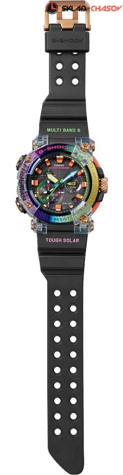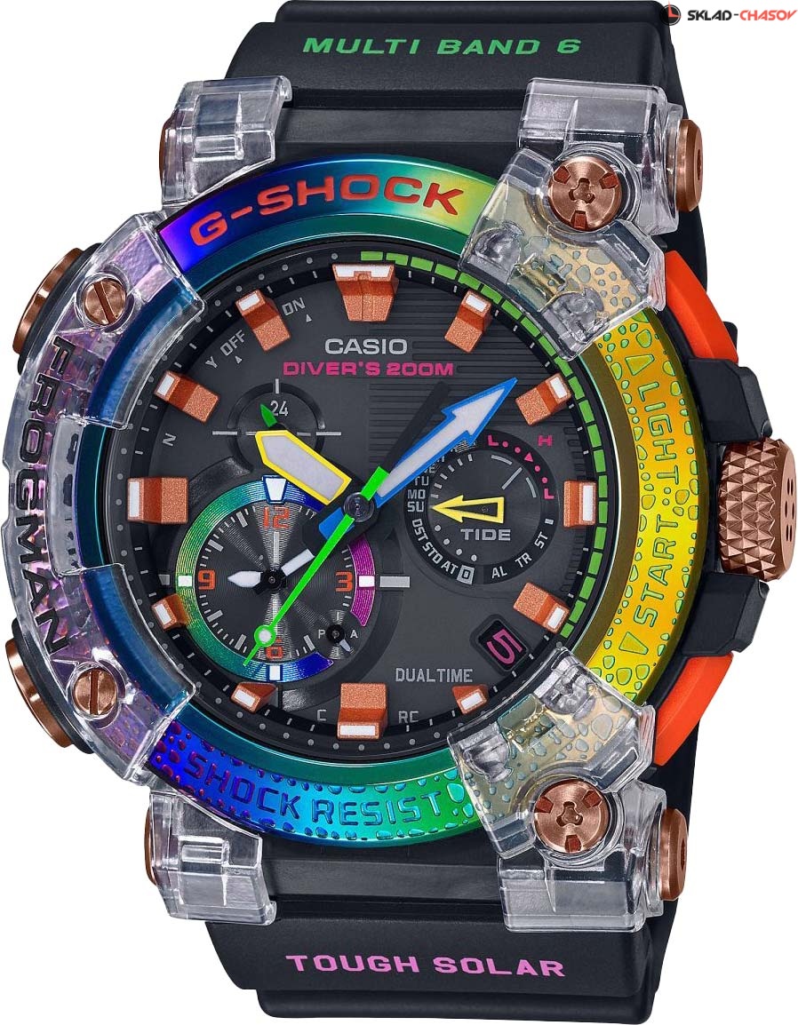 Новика часов Frogman создана не только для профессиональных дайверов, но и для простых любителей морских глубин. G-Shock Frogman. Лимитированная серия посвящена теме защиты редких видов животных. Расцветка данного корпуса вдохновлена окрасом редкой борнейской радужной жабы, обитающей на островах в районе Индонезии и которая считалась вымершей почти 90 лет, а гравировка на безеле похожа на кожу амфибии. Питание от солнечной энергии Tough Solar - солнечные батарейки большой мощности, индикатор заряда батареи. Функция автоматического сохранения энергии. Время работы аккумулятора без подзарядки до 5 месяцев, при включенной функции сохранения энергии до 30 месяцев. Противоударный корпус защищает механизм от ударов и вибрации. Ударопрочная конструкция Carbon Core Guard объединяет корпус и заднюю крышку в единый карбоновый моноблок. Защищены от магнитных полей. Циферблат подсвечивается ярким светодиодом. Послесвечение. Цвет подсветки: белый. Необритовое светонакопительное покрытие обеспечивает длительное послесвечение в темноте даже после кратковременного нахождения на свету. Секундомер со временем измерения 24ч. SPLIT-хронограф. Таймер обратного отсчета от 1мин до 24ч. Окошко даты. День недели отображаются на отдельном циферблате. Второй часовой пояс. Мировое время – 27 часовых поясов. Автоматический переход на зимнее и летнее время, возможность включения/отключения данной функции. Измерение времени погружения с точностью показаний 1с (до 2ч). Измерение времени на поверхности до 24ч. Журнал аквалангиста до 30 записей. Технология Multi Band 6 позволяет принимать сигналы от шести радиовышек, расположенных в различных точках земного шара, которые передают временные сигналы от определенных атомных часов. Коррекция текущего времени радиосигналом на территории почти всей Европы, США, Японии и Китая. Синхронизация со смартфоном по Bluetooth®. При подключении часов к смартфону корректировка текущего времени происходит автоматически, возможно переключение между домашним и мировым временем, установка летнего времени, таймера, будильника, напоминаний, отображение сведений о приливах и отливах. Функция перемещения стрелок для беспрепятственного просмотра информации. Функция автоматической коррекции положения стрелок проверяет положение стрелок каждый час и корректирует его в случае необходимости. Задняя крышка украшена выгравированным изображением лягушки. Завинчивающаяся заводная головка с защитой. Водонепроницаемость 200м (в соответствии с ISO 6425). Ремешок с классической застежкой. Подарочная упаковка в радужных цветах.