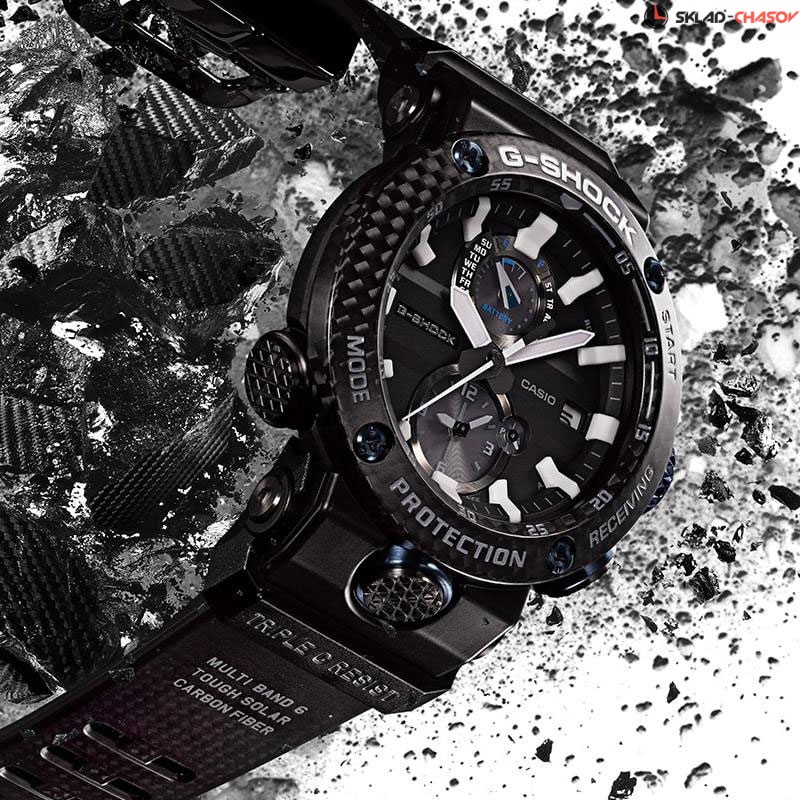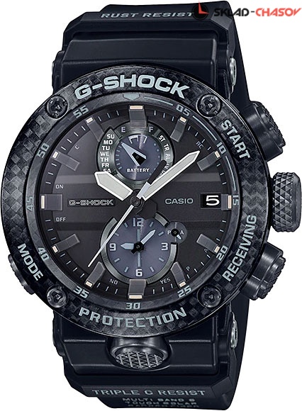Ударопрочные часы G-SHOCK никогда не подведут сложных ситуациях и всегда будут гарантировать точное время на вашем запястье. Gravity Master. Новая модель часов с противоударным корпусом, который защищает механизм от ударов и вибрации создана для пилотов. Ударопрочная конструкция Carbon Core Guard объединяет корпус и заднюю крышку в единый карбоновый моноблок. Это позволяет убрать защиту с кнопок и заводной головки, что значительно облегчает вес часов. Сами же заводная головка и кнопки, а также другие компоненты корпуса выполнены из устойчивого к коррозии и ржавчине титанового сплава, точно такой же материал используется в современных самолетах. Питание от солнечной энергии Tough Solar - солнечные батарейки большой мощности, индикатор заряда батареи. Функция автоматического сохранения энергии. Время работы аккумулятора без подзарядки - 5 месяцев, при включенной функции сохранения энергии - 18 месяцев. Светодиодная подсветка обеспечивает равномерное освещение всего циферблата. Цвет подсветки: белый. Светонакопительное покрытие необрит продолжает светиться в темноте даже после непродолжительного пребывания на свету. Технология Multi Band 6 позволяет принимать сигналы от шести радиовышек, расположенных в различных точках земного шара, которые передают временные сигналы от определенных атомных часов. Коррекция текущего времени радиосигналом на территории почти всей Европы, США, Японии и Китая. Функция автоматической коррекции положения стрелок проверяет положение стрелок каждый час и корректирует его в случае необходимости. Мировое время - 27 часовых поясов. Автоматический переход на зимнее и летнее время. Режим смены часовых поясов разработан специально для пилотов. Если при текущем отсчете времени одним нажатием кнопки установить секундомер в начальное положение, то секундомер вновь запустится с новой синхронизацией времени. Таким образом, можно мгновенно измерять несколько временных интервалов. Беспроводная технология Bluetooth со сверхнизким потреблением энергии для синхронизации со смартфоном. Настройка времени будильника на телефоне. Функция поиска телефона. Система Smart Access с помощью электронной заводной головки обеспечивает простой и удобный доступ ко всем важным функциям часов. Второй часовой пояс. 12-ти и 24-х часовой формат времени. Секундомер с точностью показаний 1с и временем измерения 24ч. Сплит-хронограф. Таймер обратного отсчета от 1мин до 24ч. Завинчивающаяся заводная головка с блокировкой.