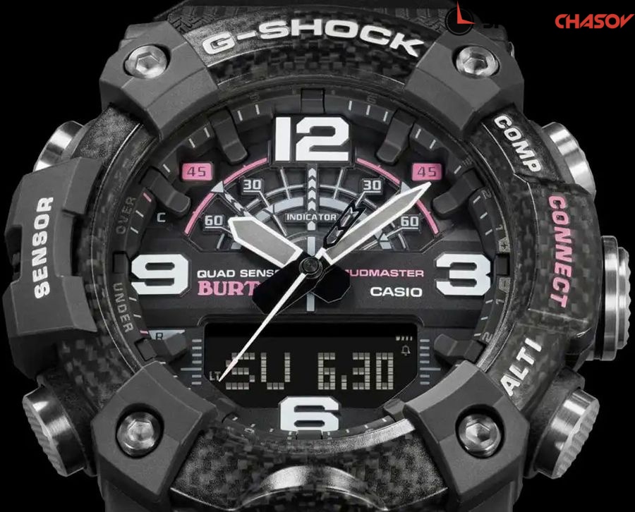 Лимитированная модель Master Of G Mudmaster, созданная при сотрудничестве с компанией BURTON, которая является всемирноизвестным производителем сноубордов. Индикатор низкого заряда батареи. Противоударный корпус с технологией Carbon Core Guard, которая защищает механизм от ударов и вибрации. Защита от попадания внутрь пыли и грязи. Электролюминесцентная подсветка освещает весь циферблат. Функция парный иллюминатор обеспечивает подсветку не только аналогового циферблата, но и цифрового дисплея. Цвет подсветки: белый. Необритовое светонакопительное покрытие обеспечивает длительное послесвечение в темноте даже после кратковременного нахождения на свету. 12-ти и 24-х часовой формат времени. Время восхода и захода Солнца. Секундомер с точностью показаний 1/100 сек. и временем измерения 24 часа. Таймер обратного отсчета времени от 1 мин. до 24 ч. Шагомер измеряет количество шагов от 0 до 999999. Высотомер - встроенный датчик барометрического давления с возможностью вывода результатов в единицах высоты над уровнем моря (до 10000 метров). Память данных высотометра до 40 записей. График набора высоты. Барометр - измерение атмосферного давления от 260 до 1100 гПа (от 195 до 825 мм рт. ст.). Встроенный датчик температуры от -10° до +60°С с точностью 0,1°C. Мировое время – 38 городов (38 часовых поясов), всемирное координированное время (UTC). Функция включения/отключения летнего времени. Беспроводная технология Bluetooth® 4.0 со сверхнизким потреблением энергии для синхронизации со смартфоном. При подключении к смартфону часы корректируют текущее время. Приложение G-SHOCK Connected Phone позволяет создавать комбинации таймера и отправлять их на часы, хранить данные измерений секундомера. Специальное приложение G-SHOCK, упрощающее настройку часов, также включает новую функцию «Миссия». Приложение автоматически записывает данные о высоте, измеренные часами, и информацию о маршруте, полученную с помощью GPS на смартфоне. Цифровой компас. Диапазон измерения от 0° до 359° с точностью 1°. Коррекция магнитного склонения. С помощью кнопки часов можно записать ваше текущее местоположение с помощью приложения. Затем секундная стрелка указывает направление к записанному местоположению, а цифровой дисплей показывает расстояние до местоположения. Функция поиска телефона. Функция перемещения стрелок для беспрепятственного просмотра информации на цифровом дисплее. Функция отключения/включения звука. Безель состоит из трех слоев тонкого пластика со вставкой из углеродного волокна. Верхний слой прозрачный, в результате чего видно карбоновую прослойку. Двойная задняя крышка: стальная закрывает механизм, а поверх неё закреплена пластина из ударопрочного тонкого пластика. Автоматический календарь (число, день недели, месяц) до 2099 года. 5 будильников, один с функцией Snooze, ежечасный сигнал. Вес 92 грамма. Гарантия 2 года.