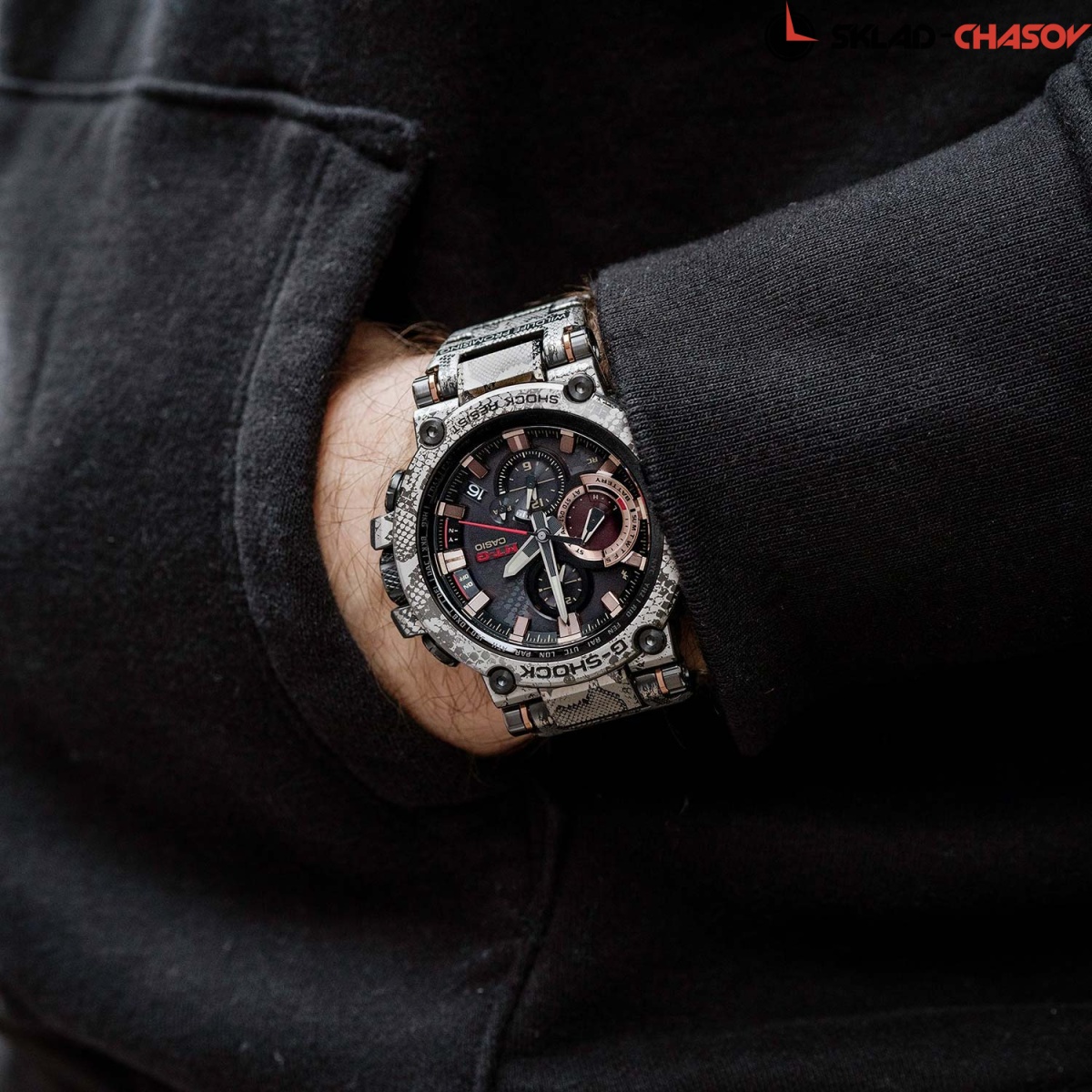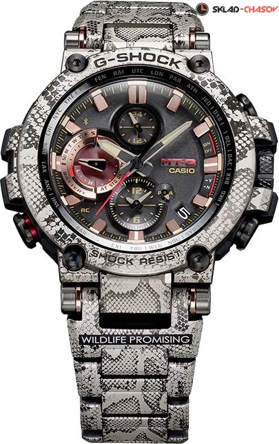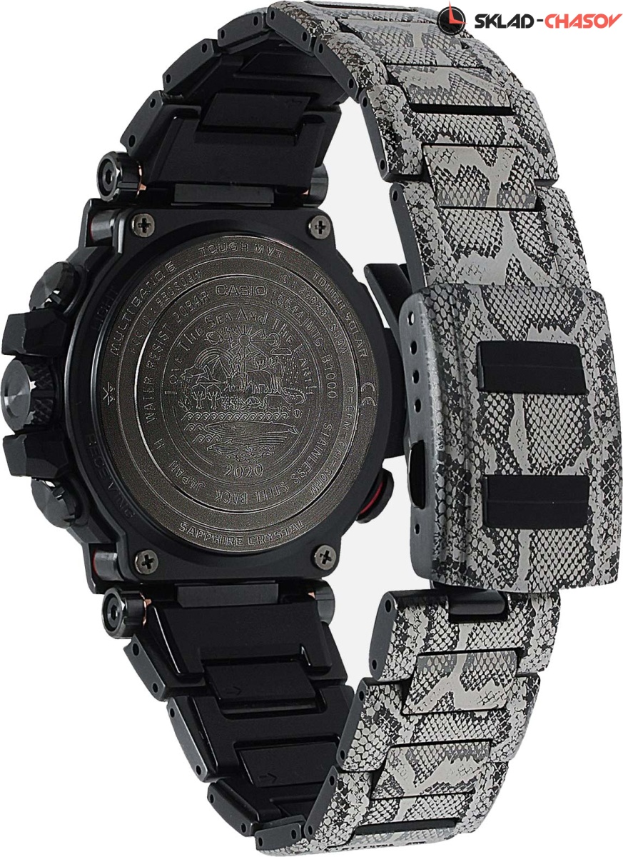 Премиальная серия G-Shock MTG подойдет ценителям высококачественных часов. MT-G. Лимитированная серия. Вдохновением для создания модели стала защита окружающей среды от вредного воздействия человека. Часы напоминают об угрозе исчезновения иероглифового питона - одной из самых крупных змей в Африке. На задней крышке выгравирован девиз «Love The Sea And The Earth» (Любите Море и Землю.) Корпус и браслет текстурированы под кожу питона. Часы премиальной серии G-SHOCK MTG собираются только в Японии на производстве Casio в Ямагата. Тройная защита Triple G Resist от воздействия гравитационной, центробежной и вибрационной сил. Противоударный корпус защищает механизм от ударов и вибрации. Внутри, гасящий любые удары, слой из материала Alpha Gel® и металлическая капсула с механизмом часов. Питание от солнечной энергии Tough Solar - солнечные батарейки большой мощности, индикатор заряда батареи. Функция автоматического сохранения энергии. Время работы аккумулятора без подзарядки - 5 месяцев, при включенной функции сохранения энергии - 18 месяцев. Циферблат подсвечивается ярким светодиодом. Послесвечение. Цвет подсветки: белый. Необритовое светонакопительное покрытие обеспечивает длительное послесвечение в темноте даже после кратковременного нахождения на свету. Секундомер с точностью показаний 1с и временем измерения 24ч. SPLIT-хронограф. Таймер обратного отсчета от 1мин до 24ч. Окошко даты. Ретроградный указатель дня недели. Второй часовой пояс. Мировое время – 27 городов (39 часовых поясов), всемирное координированное время (UTC). Автоматический переход на зимнее и летнее время, возможность включения/отключения данной функции. Технология Multi Band 6 позволяет принимать сигналы от шести радиовышек, расположенных в различных точках земного шара, которые передают временные сигналы из определенных атомных часов. Коррекция текущего времени радиосигналом почти по всему миру: Англия, Германия, США, Япония и Китай. Функция автоматической коррекции положения стрелок проверяет положение стрелок каждый час и корректирует его в случае необходимости. Синхронизация со смартфоном по Bluetooth® через приложение SHOCK-Connected G. При подключении к смартфону часы корректируют текущее время (до 6 раз в день), настройки мирового времени (300 городов), таймера и будильника. Система Smart Access с помощью электронной заводной головки обеспечивает простой и удобный доступ ко всем важным функциям часов. Нажатие или поворот заводной головки позволяет переключаться между различными режимами и активировать будильник, таймер, секундомер, а также настраивать функцию мирового времени. Блокировка заводной головки. Функция поиска телефона. Стальной безель. Завинчивающаяся заводная головка с защитой. Водонепроницаемость 200м (в соответствии с ISO 2281). Литой стальной браслет с пластиковыми вставками и системой быстрой замены. Тройная раскладывающаяся застежка, расстегиваемая одним касанием. Застежка с системой блокировки. Подарочная упаковка.