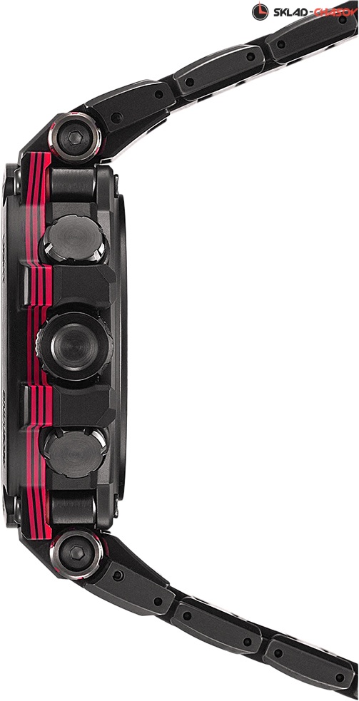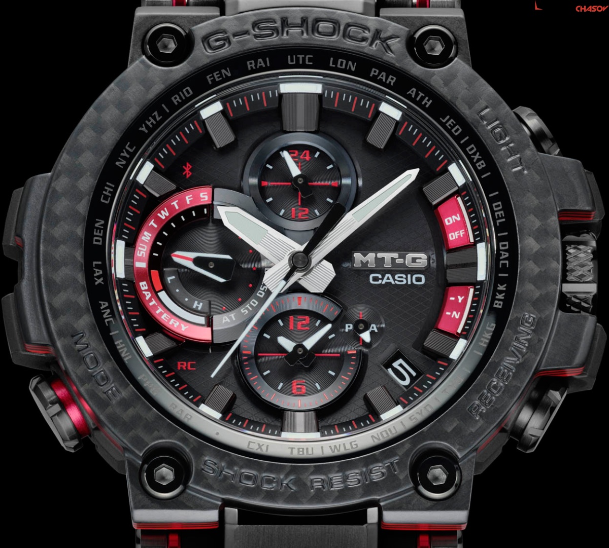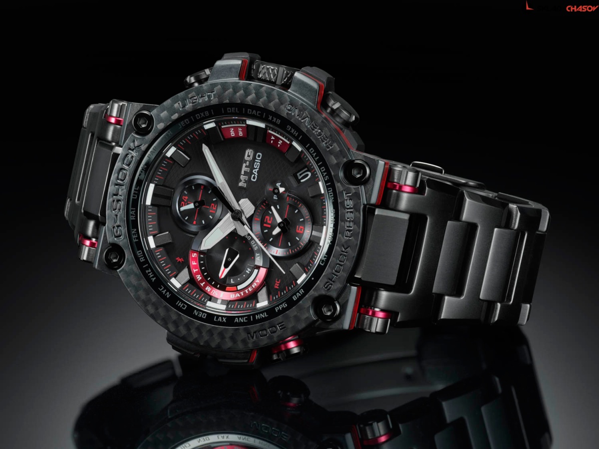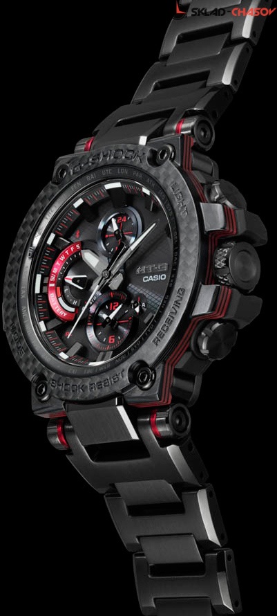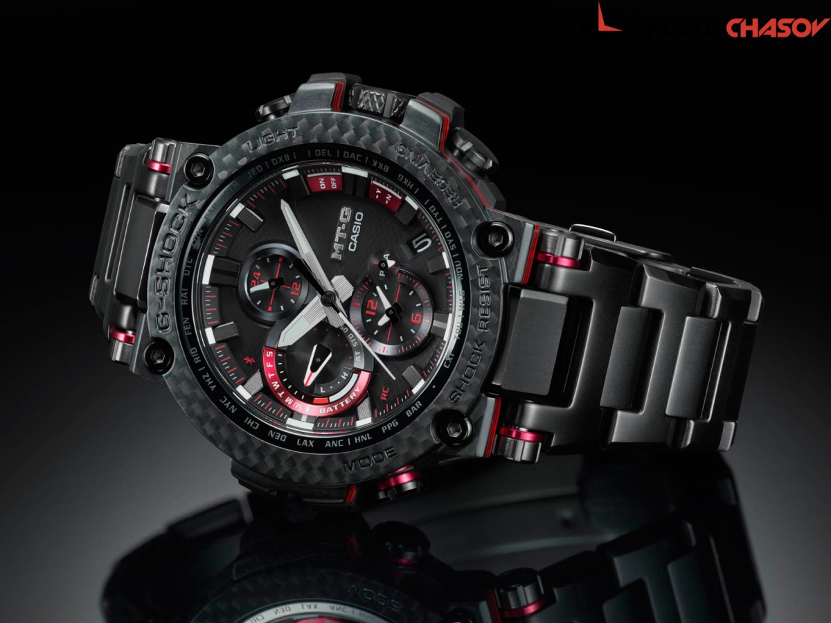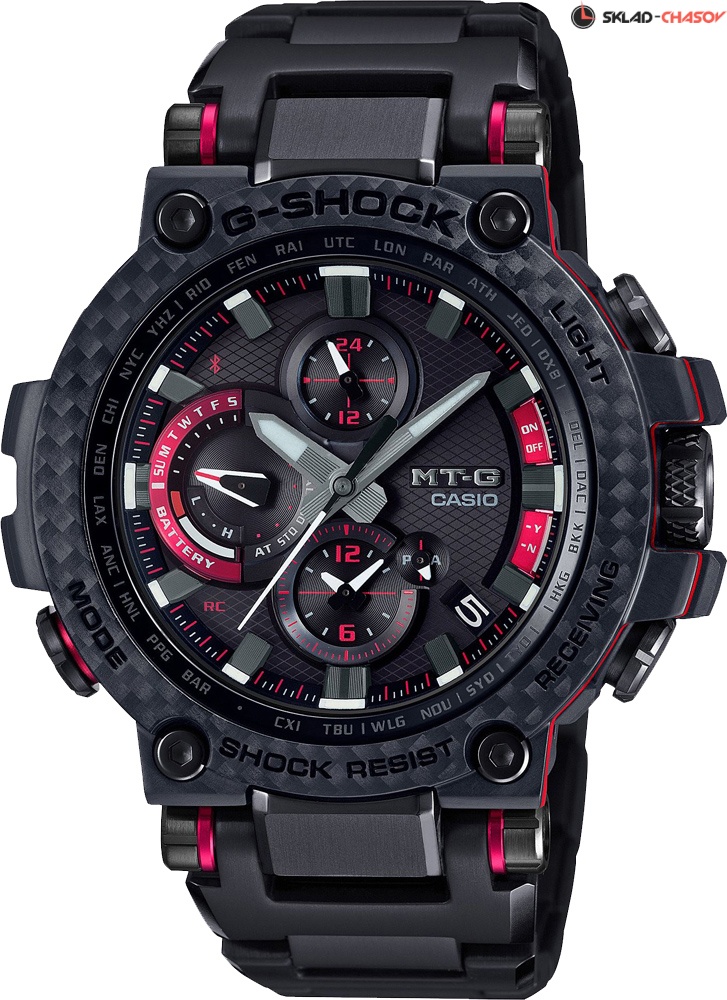 Премиальная серия G-Shock MTG подойдет ценителям высококачественных часов. MT-G. Часы премиальной серии G-SHOCK MTG собираются только в Японии на производстве Casio в Ямагата. Противоударный корпус защищает механизм от ударов и вибрации. Тройная защита от воздействия гравитационной, центробежной и вибрационной сил. Питание от солнечной энергии Tough Solar - солнечные батарейки большой мощности, индикатор заряда батареи. Функция автоматического сохранения энергии. Время работы аккумулятора без подзарядки - 5 месяцев, при включенной функции сохранения энергии - 18 месяцев. Циферблат подсвечивается ярким светодиодом. Цвет подсветки: белый. Необритовое светонакопительное покрытие обеспечивает длительное послесвечение в темноте даже после кратковременного нахождения на свету. Технология Multi Band 6 позволяет принимать сигналы от шести радиовышек, расположенных в различных точках земного шара, которые передают временные сигналы из определенных атомных часов. Коррекция текущего времени радиосигналом почти по всему миру: Англия, Германия, США, Япония и Китай. Функция автоматической коррекции положения стрелок проверяет положение стрелок каждый час и корректирует его в случае необходимости. Мировое время – 27 городов (39 часовых поясов), всемирное координированное время (UTC). Автоматический переход на зимнее и летнее время, возможность включения/отключения данной функции. Второй часовой пояс. 12-ти и 24-х часовой формат времени. Система Smart Access с помощью электронной заводной головки обеспечивает простой и удобный доступ ко всем важным функциям часов. Нажатие или поворот заводной головки позволяет переключаться между различными режимами и активировать будильник, таймер, секундомер, а также настраивать функцию мирового времени. Блокировка заводной головки. Секундомер с точностью показаний 1с и временем измерения 24ч. SPLIT-хронограф. Таймер обратного отсчета от 1мин до 24ч. Синхронизация со смартфоном по Bluetooth® через приложение SHOCK-Connected G. При подключении к смартфону часы корректируют текущее время (4 раза в день), настройки мирового времени (300 городов), таймера и будильника. Автоматическая корректировка часового пояса и летнего времени. Функция поиска телефона. Индикатор уровня заряда батареи телефона. Карбоновый безель. Завинчивающаяся заводная головка с защитой. Раскладывающаяся застежка, расстегиваемая одним касанием.