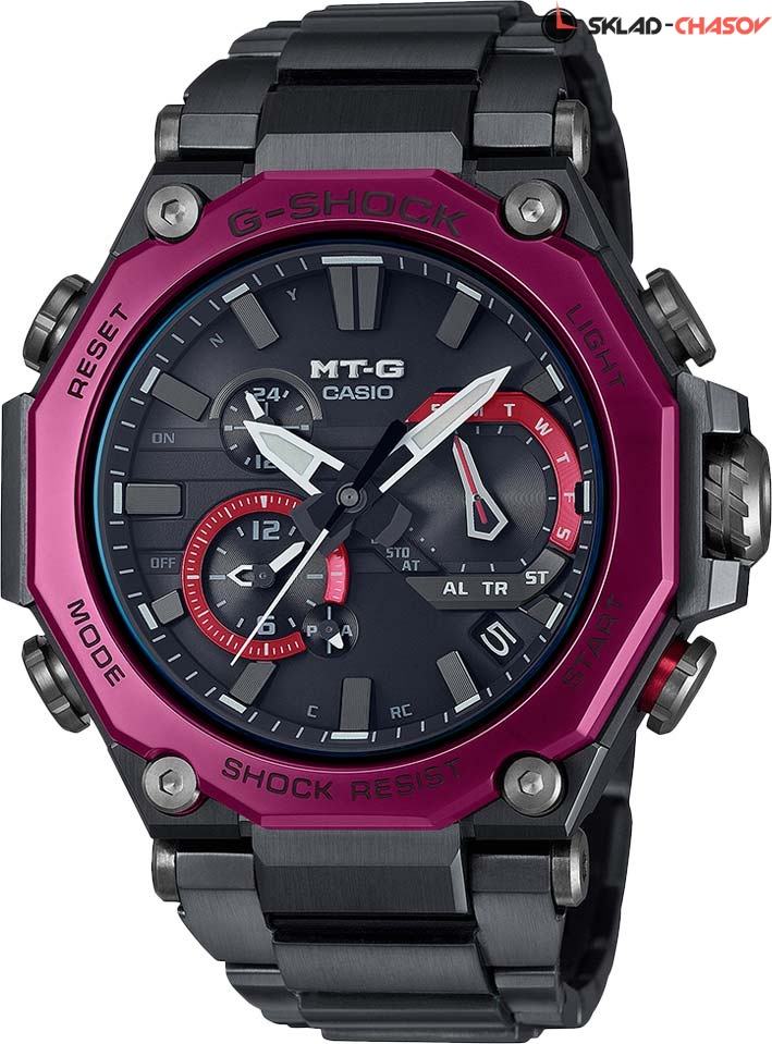 Высокотехнологичные часы с надежной противоударной системой созданы для тех, кто не представляет свою жизнь без приключений. MT-G. Новинка в премиальной серии часов G-SHOCK MTG, которые собираются только в Японии на производстве Casio в Ямагата. Противоударный корпус защищает механизм от ударов и вибрации. Противоударная система Dual Core Guard состоит из двух систем Carbon Core Guard и Metal Core Card. Тройная защита Triple G Resist от воздействия гравитационной, центробежной и вибрационной сил. Питание от солнечной энергии Tough Solar - солнечные батарейки большой мощности, индикатор заряда батареи. Функция автоматического сохранения энергии. Время работы аккумулятора без подзарядки - 5 месяцев, при включенной функции сохранения энергии - 29 месяцев. Модуль часов рассчитан на работу при низких температурах -10°С/14°F. Циферблат подсвечивается ярким светодиодом. Послесвечение. Цвет подсветки: белый. Необритовое светонакопительное покрытие обеспечивает длительное послесвечение в темноте даже после кратковременного нахождения на свету. Секундомер с точностью показаний 1с и временем измерения 24ч. SPLIT-хронограф. Таймер обратного отсчета от 1мин до 24ч. Окошко даты. День недели отображается на отдельном циферблате. Второй часовой пояс. Мировое время – 27 часовых поясов. Автоматический переход на зимнее и летнее время. Технология Multi Band 6 позволяет принимать сигналы от шести радиовышек, расположенных в различных точках земного шара, которые передают временные сигналы из определенных атомных часов. Коррекция текущего времени радиосигналом почти по всему миру: Англия, Германия, США, Япония и Китай. Функция автоматической коррекции положения стрелок проверяет положение стрелок каждый час и корректирует его в случае необходимости. Система Smart Access с помощью электронной заводной головки обеспечивает простой и удобный доступ ко всем важным функциям часов. Нажатие или поворот заводной головки позволяет переключаться между различными режимами и активировать будильник, таймер, секундомер, а также настраивать функцию мирового времени. Синхронизация со смартфоном по Bluetooth® через приложение SHOCK-Connected G. При подключении к смартфону часы корректируют текущее время, настройки мирового времени (300 городов), таймера и будильника. Блокировка заводной головки. Функция поиска телефона. Функция перемещения стрелок для беспрепятственного просмотра информации. Завинчивающаяся заводная головка с защитой. Водонепроницаемость 200м (в соответствии с ISO 2281). Литой стальной браслет с тройной раскладывающейся застежкой, расстегиваемой одним касанием. Застежка с системой блокировки.