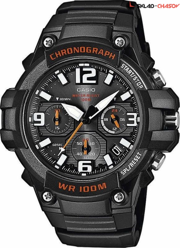 Часы-хронограф с секундомером.12-ти и 24-х часовой формат времени.Секундомер с точностью показаний 1 сек. и временем измерения 30 мин.В В Заводная головка с защитой. Вес 50 грамм. Гарантия 2 года.