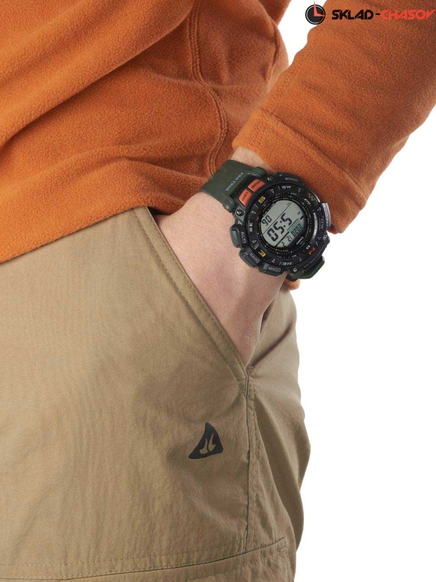 Часы Pro Trek станут незаменимым помощником в путешествиях и походах. Protrek. Новая расцветка в часах серии Pro Trek PRG-240. Питание от солнечной энергии Tough Solar - солнечные батарейки большой мощности, индикатор заряда батареи. Функция автоматического сохранения энергии. Время работы аккумулятора без подзарядки приблизительно 6 месяцев, при включенной функции сохранения энергии приблизительно 23 месяца. Модуль часов рассчитан на работу при низких температурах до -10°С/14°F. Электролюминесцентная подсветка освещает весь циферблат. Подсветка активируется при недостаточном свете и выключается, когда освещения достаточно. Послесвечение. Цвет подсветки: сине-зеленый. 12-ти и 24-х часовой формат времени. Секундомер с точностью показаний 1/100с и временем измерения 24ч. SPLIT-хронограф. Таймер обратного отсчета от 1мин до 1ч. Мировое время – 48 городов (31 часовой пояс). Функция включения/отключения летнего времени. Технология Triple Sensor позволяет точно и легко определять сторону света, температуру и атмосферное давление. Термометр от -10° до +60°С (от 14 до 140 °F) с точностью 0,1°C. Барометр - измерение атмосферного давления от 260 до 1100 гПа (от 195 до 825 мм рт. ст.). График тенденции и перепада атмосферного давления. Встроенный цифровой компас измеряет и отображает направление в виде одной из 16 точек. Диапазон измерения от 0° до 359° с точностью 1°. Графический указатель направления. Двунаправленная калибровка и функция северной калибровки. Высотомер - встроенный датчик барометрического давления с возможностью вывода результатов в единицах высоты над уровнем моря (от -700 до 10000 метров), единица измерения 5м. График набора высоты. Хранение до 25 записей о высотных точках рельефа местности - измеренной абсолютной высоты, даты и времени. Время восхода и захода Солнца. Двойной ЖК-дисплей позволяет одновременно отображать различные типы данных. Удобное расположение кнопок позволяет управлять устройством в одно касание. Функция отключения/включения звука кнопок. Вращающийся безель. Водонепроницаемость в соответствии с ISO 2281. Ремешок с классической застежкой.