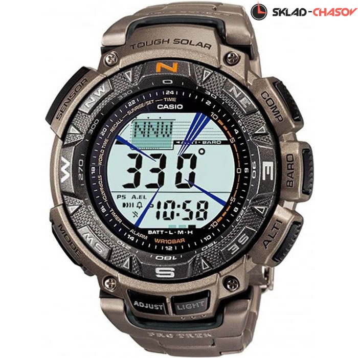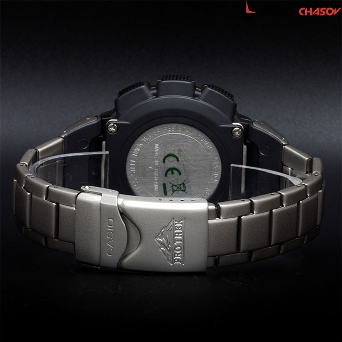 Надежные многофункциональные кварцевые часы из коллекции Pro-Trek для любителей приключений и активного отдыха. Электронный (цифровой) способ отображения времени. Двойной электронный дисплей. Точность хода не хуже +/-15 секунд в месяц. Питание от солнечной энергии, индикатор заряда батареи. Автоматическая электролюминесцентная подсветка. Встроенный цифровой компас. Альтиметр: встроенный датчик барометрического давления с возможностью вывода результатов в единицах высоты над уровнем моря. Максимальная высота - 10000 метров над уровнем моря. Барометр: встроенный датчик давления для измерения барометрического давления. Термометр. Мировое время в основных городах. Функция отображения времени восхода и захода солнца на основании введенных данных о широте и долготе в точке местонахождения. Секундомер с точностью показаний 1/100 сек и максимальным временем измерения - 24 часа. Таймер обратного отсчета. 5 ежедневных будильников. Автоматический календарь. Функция включения/выключения звука. Безель с направлениями сторон света. Часы рассчитаны на работу при низких температурах. Минеральное стекло высокой прочности устойчиво к мелким механическим повреждениям. Титановый браслет с тройным сгибом. Размеры корпуса 50.9x57.3x15.3 мм.