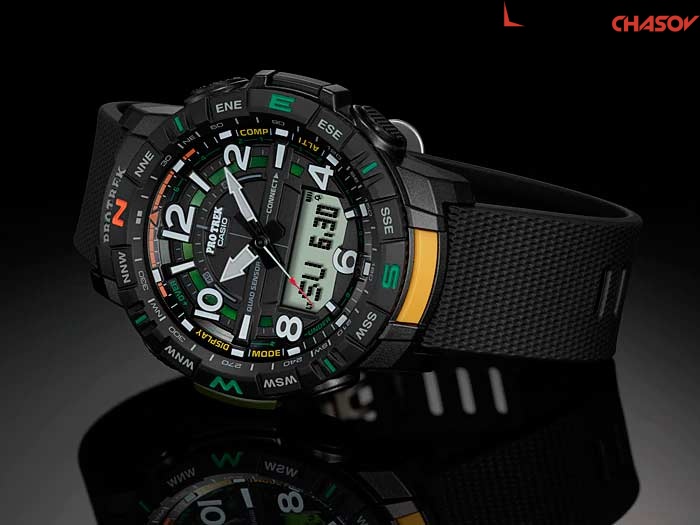 Модель Casio из нового поколения часов Pro Trek, созданных для путешествий, хайкинга и активного времяпровождения на природе. Модуль часов рассчитан на работу при низких температурах до -10°С/14°F. Двойная подcветка: лицо и циферблат подсвечиваются светодиодом, благодаря наличию функции задержки, после отпускания кнопки освещение горит еще несколько секунд. Необритовое светонакопительное покрытие обеспечивает длительное послесвечение в темноте даже после кратковременного нахождения на свету. 3-осевой акселерометр автоматически начинает отсчет шагов на дисплее, когда вы начинаете бегать или участвовать в других действиях во время ношения часов. Шагомер измеряет количество шагов от 0 до 999999. Синхронизация по Bluetooth со смартфоном на котором запущено приложение PRO TREK Connected. При подключении к смартфону часы корректируют текущее время. Мировое время – 38 городов (38 часовых поясов), всемирное координированное время (UTC). Автоматический переход на зимнее и летнее время, возможность включения/отключения данной функции. 12-ти и 24-х часовой формат времени. Вращающийся безель. Время восхода и захода Солнца. Технология Quad Sensor позволяет точно и легко определять сторону света, температуру и атмосферное давление. Термометр от -10° до +60°С с точностью 0,1°C. Барометр - измерение атмосферного давления от 260 до 1100 гПа (от 195 до 825 мм рт. ст.). Встроенный цифровой компас. Диапазон измерения от 0° до 359° с точностью 1°. Высотомер - встроенный датчик барометрического давления с возможностью вывода результатов в единицах высоты над уровнем моря (от -700 до 10000 метров). График набора высоты. Хранение до 40 записей о высотных точках рельефа местности - измеренной абсолютной высоты, даты и времени. С помощью встроенного датчика GPS на смартфоне, можно определить высоту, установить пункт назначения или функцию возвращения назад. Секундомер с точностью показаний 1/100 с и временем измерения 24 ч. Сплит-хронограф. Таймер обратного отсчета от 1 с до 1 ч. Функции перемещения стрелок для беспрепятственного просмотра информации на цифровых дисплеях, отключения/включения звука и поиска телефона. Индикатор заряда батареи. 5 будильников, ежечасный сигнал. Автоматический календарь до 2099 года. Вес 64 грамма. Гарантия 2 года.