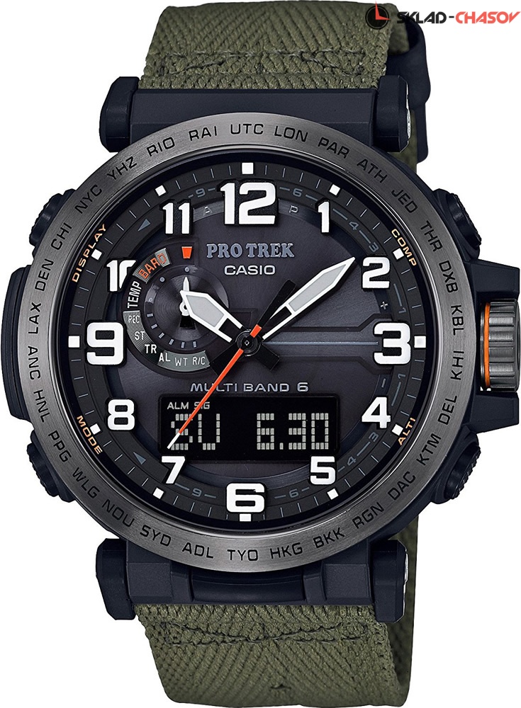 Гарантия 2 года. 12-ти и 24-х часовой формат времени. Питание от солнечной энергии Tough Solar - солнечные батарейки большой мощности, индикатор заряда батареи. Функция автоматического сохранения энергии. Время работы аккумулятора без подзарядки - 6 месяцев, при включенной функции сохранения энергии - 25 месяцев. Модуль часов рассчитан на работу при низких температурах до -10°С/14°F. Циферблат подсвечивается ярким светодиодом, при недостаточном освещении во время поворота запястья в сторону лица подсветка включается автоматически. Светонакопительное покрытие необрит продолжает светиться в темноте даже после непродолжительного пребывания на свету. Технология Multi Band 6 позволяет принимать сигналы от шести радиовышек, расположенных в различных точках земного шара, которые передают временные сигналы от определенных атомных часов. Коррекция текущего времени радиосигналом на территории почти всей Европы, США, Японии и Китая. Функция автоматической коррекции положения стрелок проверяет положение стрелок каждый час и корректирует его в случае необходимости. Мировое время – 29 городов (29 часовых поясов), всемирное координированное время (UTC). Функция включения/отключения летнего времени. Технология Triple Sensor позволяет точно и легко определять сторону света, температуру и атмосферное давление. Термометр от -10° до +60°С с точностью 0,1°C. Барометр - измерение атмосферного давления от 260 до 1100 гПа (от 195 до 825 мм рт. ст.). Встроенный цифровой компас. Диапазон измерения от 0° до 359° с точностью 1°. Высотомер - встроенный датчик барометрического давления с возможностью вывода результатов в единицах высоты над уровнем моря (от -700 до 10000 метров). Хранение до 30 записей о высотных точках рельефа местности - измеренной абсолютной высоты, даты и времени. Система Smart Access с помощью электронной заводной головки обеспечивает простой и удобный доступ ко всем важным функциям часов. Нажатие или поворот заводной головки позволяет переключаться между различными режимами и активировать будильник, таймер, секундомер, а также настраивать функцию мирового времени. Секундомер с точностью показаний 1/100 сек. и временем измерения 24 часа. Сплит-хронограф. Таймер обратного отсчета от 1 сек. до 1 часа. Функция отключения/включения звука. 5 будильников, ежечасный сигнал. Безель из нержавеющей стали с PVD покрытием. Заводная головка с защитой. Вес 67 грамм. Функции: Будильник. Секундомер. Компас. Tаймер обратного отсчета. День недели. Месяц. Число. Солнечная батарея. Барометр. Мировое время. Радиосинхронизация. Термометр. Комплектация: Часы, фирменная упаковка, фирменный пакет, инструкция на русском языке, заполненный гарантийный талон.