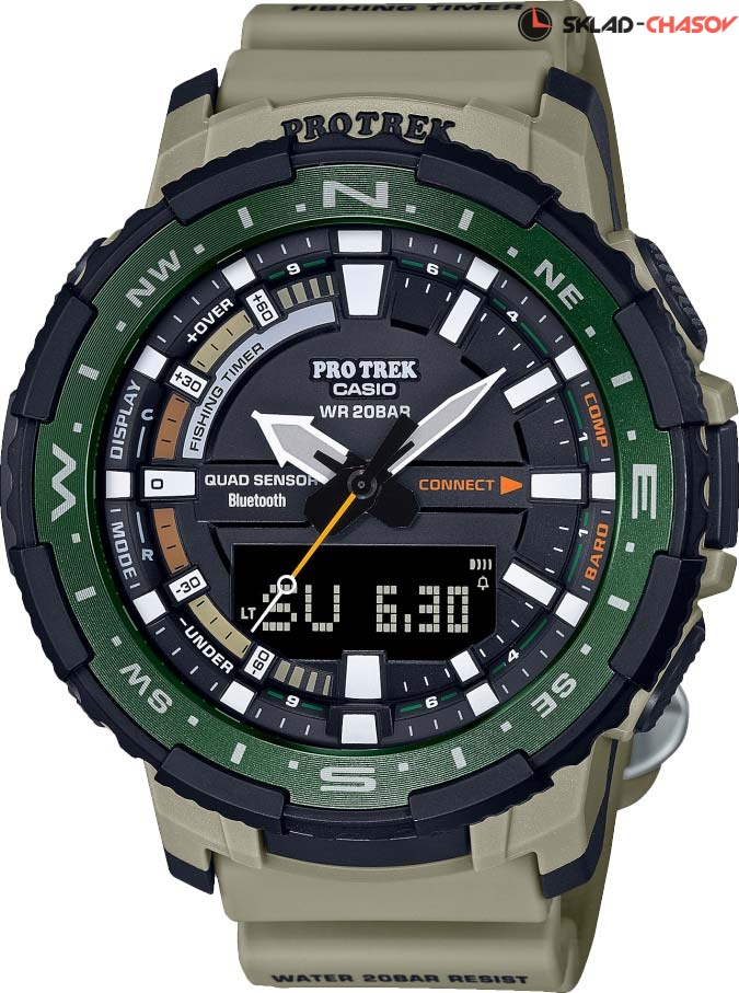 Заядлым рыбакам посвящается - абсолютно новые усовершенствованные часы, с которыми можно отправиться даже на Северный Полюс. Pro Trek. Новинка в линейке Pro Trek. Чтобы получить доступ ко всем функциям, специально разработанным для рыбалки, просто синхронизируйте ваши часы по Bluetooth со смартфоном, на котором запущено приложение PRO TREK Connected. Индикатор Fishing Timer- определяет время, наиболее подходящее для рыбалки. На экране отображаются символы в виде рыбы в том случае, если время идеально подходит для рыбалки. Двойная подcветка: одно нажатие кнопки обеспечит подсветку не только цифрового дисплея, но и аналогового циферблата. Благодаря наличию функции задержки, после отпускания кнопки освещение горит еще несколько секунд. Цвет подсветки: белый. Модуль часов рассчитан на работу при низких температурах до -10°С/14°F. 12-ти и 24-х часовой формат времени. Секундомер с двумя точностями показаний: 1/100с (до 1ч) и 1с (после 1ч) и временем измерения 24ч. SPLIT-хронограф. Таймер обратного отсчета от 1с до 24ч. При подключении к смартфону часы корректируют текущее время и до 4 раз в день автоматически калибруют данные о высоте, на основе информации полученной через GPS. Мировое время – 38 городов (38 часовых поясов), всемирное координированное время (UTC). Автоматический переход на зимнее и летнее время, возможность включения/отключения данной функции. Время восхода и захода Солнца. Технология Quad Sensor позволяет точно и легко определять сторону света, температуру и атмосферное давление и количество шагов. 3-осевой акселерометр автоматически начинает отсчет шагов на дисплее, когда вы начинаете бегать или участвовать в других действиях во время ношения часов. Шагомер измеряет количество шагов от 0 до 999999. С помощью приложения можно рассчитать калории, определить местоположение, настроить дисплей получить данные о мировом времени (более 300 городов). Термометр от -10° до +60°С с точностью 0,1°C. Барометр - измерение атмосферного давления от 260 до 1100 гПа (от 195 до 825 мм рт. ст.). Встроенный цифровой компас. Диапазон измерения от 0° до 359° с точностью 1°. Высотомер - встроенный датчик барометрического давления с возможностью вывода результатов в единицах высоты над уровнем моря (от -700 до 10000 метров). График набора высоты. Хранение до 40 записей о высотных точках рельефа местности - измеренной абсолютной высоты, даты и времени. С помощью встроенного датчика GPS на смартфоне, можно определить высоту, установить пункт назначения или функцию возвращения назад. Отображение сведений для 3300 основных прибрежных точках по всему миру о приливах и отливах на заданную дату и время. Отображение возраста и фазы Луны на выбранную дату. Функции перемещения стрелок для беспрепятственного просмотра информации на цифровых дисплеях, отключения/включения звука и поиска телефона. Вращающийся безель с алюминиевой вставкой и разметкой компаса. Ремешок из полимерного материала с классической застежкой.