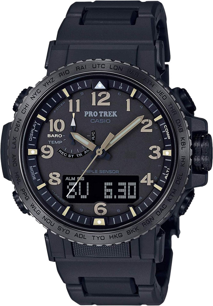 Часы PRO TREK созданы для любителей горных восхождений и активного образа жизни. Pro Trek. Новинка в премиальной линейке Pro Trek. За основу взята модель PRW-60. Питание от солнечной энергии Tough Solar - солнечные батарейки большой мощности, индикатор заряда батареи. Функция автоматического сохранения энергии. Время работы аккумулятора без подзарядки приблизительно 6 месяцев, при включенной функции сохранения энергии приблизительно 25 месяцев. Модуль часов рассчитан на работу при низких температурах до -10°С/14°F. Двойная подcветка: лицо и циферблат подсвечиваются светодиодом, благодаря наличию функции задержки, после отпускания кнопки освещение горит еще несколько секунд. Необритовое светонакопительное покрытие обеспечивает длительное послесвечение в темноте даже после кратковременного нахождения на свету. Технология Multi Band 6 позволяет принимать сигналы от шести радиовышек, расположенных в различных точках земного шара, которые передают временные сигналы от определенных атомных часов. Коррекция текущего времени радиосигналом на территории почти всей Европы, США, Японии и Китая. Функция автоматической коррекции положения стрелок проверяет положение стрелок каждый час и корректирует его в случае необходимости. Мировое время – 29 городов (29 часовых поясов), всемирное координированное время (UTC). Автоматический переход на зимнее и летнее время, возможность включения/отключения данной функции. 12-ти и 24-х часовой формат времени. Термометр от -10° до +60°С с точностью 0,1°C. Барометр - измерение атмосферного давления от 260 до 1100 гПа (от 195 до 825 мм рт. ст.). Встроенный цифровой компас. Высотомер - встроенный датчик барометрического давления с возможностью вывода результатов в единицах высоты над уровнем моря (от –700 до 10000 метров). График набора высоты. Хранение до 30 записей о высотных точках рельефа местности - измеренной абсолютной высоты, даты и времени. Система Smart Access с помощью электронной заводной головки обеспечивает простой и удобный доступ ко всем важным функциям часов. Нажатие или поворот заводной головки позволяет переключаться между различными режимами и активировать будильник, таймер, секундомер, а также настраивать функцию мирового времени. Секундомер с точностью показаний 1/100с и временем измерения 24ч. SPLIT-хронограф. Таймер обратного отсчета от 1с до 1ч. Функция отключения/включения звука. Функция перемещения стрелок для беспрепятственного просмотра информации на цифровом дисплее. Стальной безель. Заводная головка с защитой и блокировкой. Раскладывающаяся застежка, расстегиваемая одним касанием. Застежка с системой блокировки.