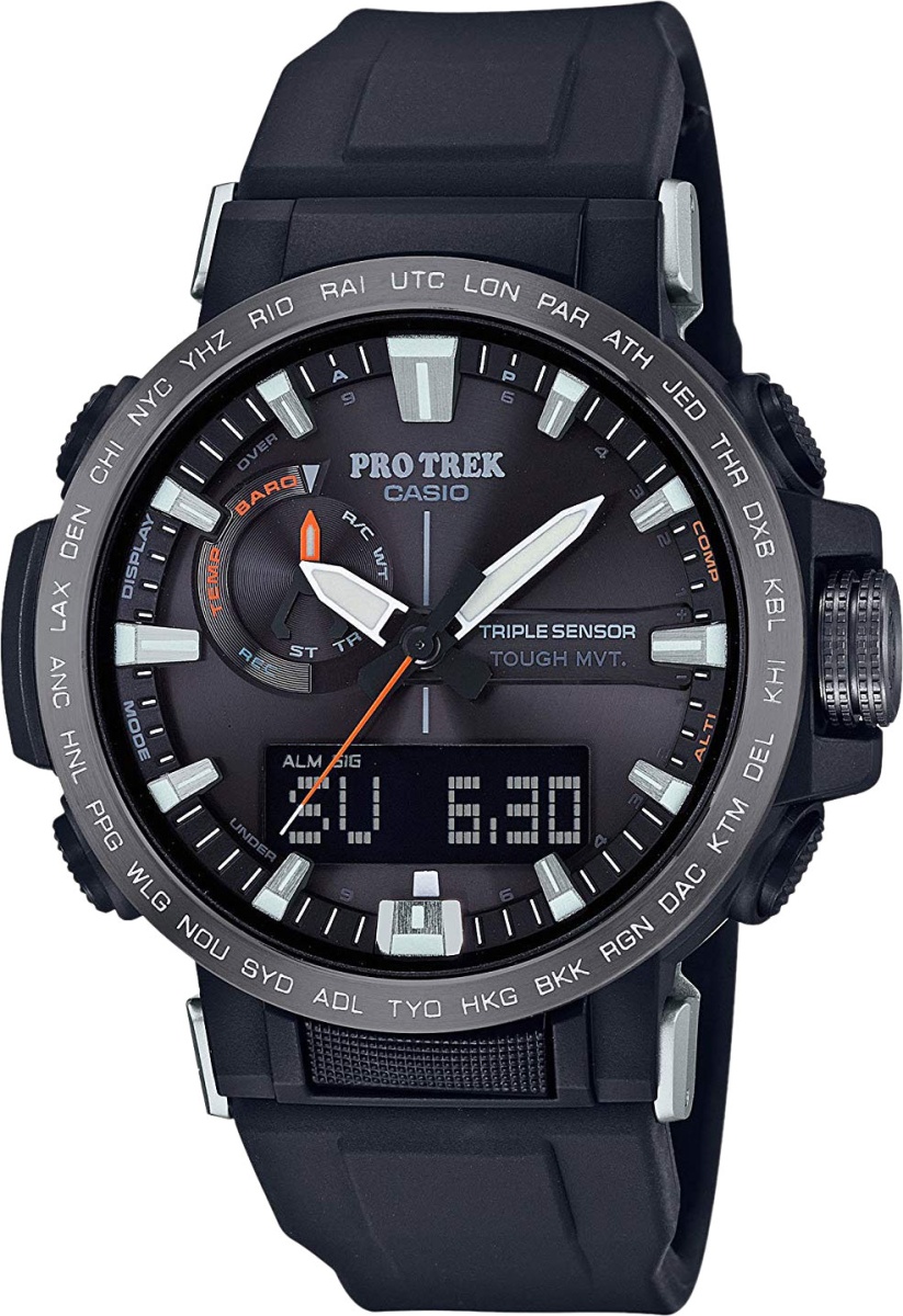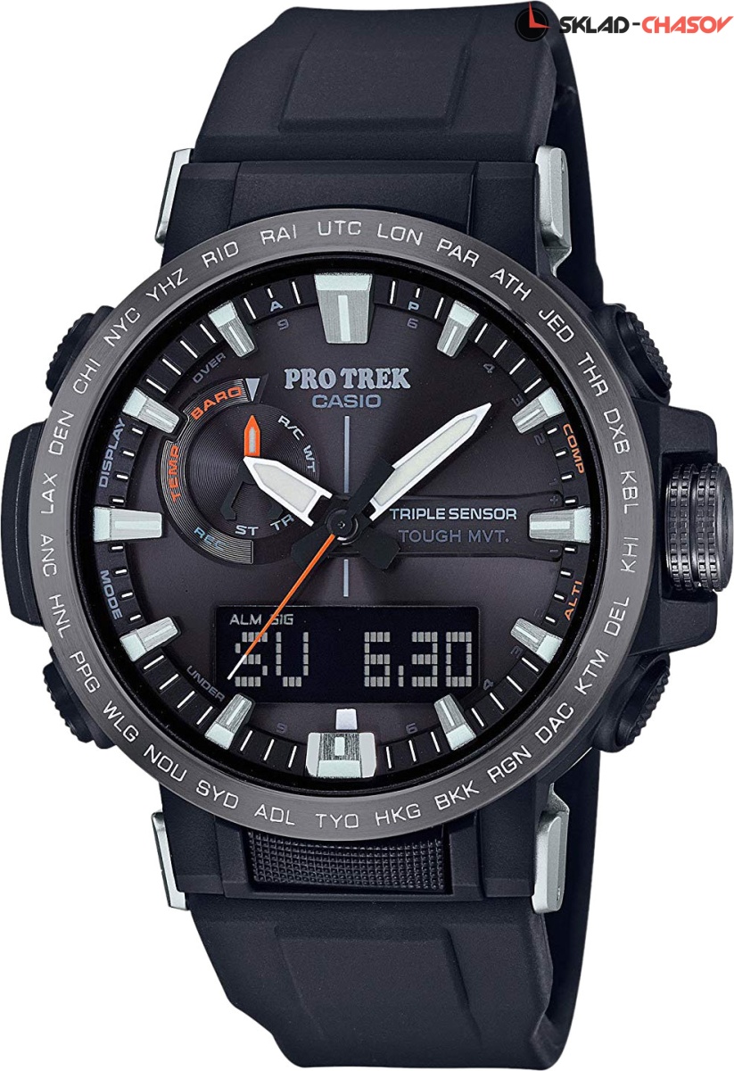 Многие фаны горных восхождений и любители активного образа жизни знают, что PRO TREK — это именно те часы, на которые можно положиться. Pro Trek. Эти часы стали лидерами серии PRO TREK. Эти часы стали более утонченными, нежели их собратья по серии PRW-6000, а также устойчивыми к ударным нагрузкам, и получили более практичную солнечную батарею. Питание от солнечной энергии Tough Solar - солнечные батарейки большой мощности, индикатор заряда батареи. Функция автоматического сохранения энергии. Модуль часов рассчитан на работу при низких температурах до -10°С/14°F. Полностью автоматическая светодиодная подсветка автоматически отключается при достаточной освещенности и включается при слабой освещенности и в темноте. Необритовое светонакопительное покрытие обеспечивает длительное послесвечение в темноте даже после кратковременного нахождения на свету. Технология Multi Band 6 позволяет принимать сигналы от шести радиовышек, расположенных в различных точках земного шара, которые передают временные сигналы от определенных атомных часов. Коррекция текущего времени радиосигналом на территории почти всей Европы, США, Японии и Китая. Функция автоматической коррекции положения стрелок проверяет положение стрелок каждый час и корректирует его в случае необходимости. Мировое время . Функция включения/отключения летнего времени. 12-ти и 24-х часовой формат времени. Технология Triple Sensor позволяет точно и легко определять сторону света, температуру и атмосферное давление. Термометр от -10° до +60°С с точностью 0,1°C. Барометр - измерение атмосферного давления от 260 до 1100 гПа (от 195 до 825 мм рт. ст.). Встроенный цифровой компас. Диапазон измерения от 0° до 359° с точностью 1°. Высотомер - встроенный датчик барометрического давления с возможностью вывода результатов в единицах высоты над уровнем моря (от -700 до 10000 метров). График набора высоты. Хранение до 40 записей о высотных точках рельефа местности - измеренной абсолютной высоты, даты и времени. Система Smart Access с помощью электронной заводной головки обеспечивает простой и удобный доступ ко всем важным функциям часов. Нажатие или поворот заводной головки позволяет переключаться между различными режимами и активировать будильник, таймер, секундомер, а также настраивать функцию мирового времени. Секундомер с точностью показаний 1/100с и временем измерения 24ч. Сплит-хронограф. Таймер обратного отсчета от 1с до 1ч. Функция перемещения стрелок для беспрепятственного просмотра информации на цифровых дисплеях. Функция отключения/включения звука. Стальной безель. Завинчивающаяся заводная головка с защитой и блокировкой.