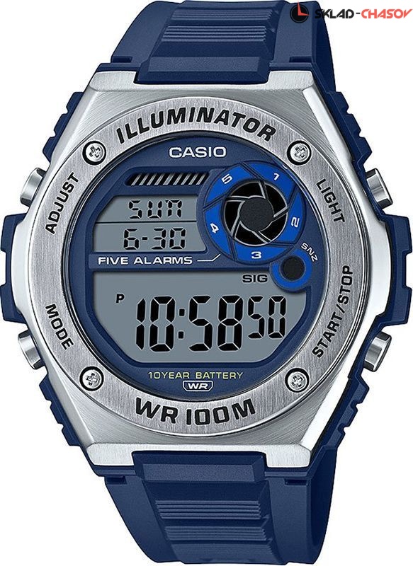 Часы Casio с секундомером и таймером на ремешке. Корпус выполнен из пластика со стальной накладкой. Циферблат подсвечивается ярким светодиодом. Функция задержки отключения - подсветка горит еще несколько секунд после отпускания кнопки освещения. Одновременное отображение текущего времени в двух разных часовых поясах.12-ти и 24-х часовой формат времени. Секундомер с точностью показаний 1/100 сек. и временем измерения 24 часа, сплит-хронограф (позволяет регистрировать отдельные отрезки времени, время с промежуточным результатом и время двойного финиша). Таймер обратного отсчета с автоповтором от 1 сек. до 24 часов. 5 независимых будильников, ежечасный сигнал. Полностью автоматический календарь, учитываются месяцы разной продолжительности и високосные годы. Ремешок из полимерного материала с классической застежкой. Задняя крышка из нержавеющей стали с креплением к корпусу на винтах. Батарея рассчитана на 10 лет. Водонепроницаемость в соответствии с ISO 2281. Вес часов 55 грамм. Гарантия 2 года.