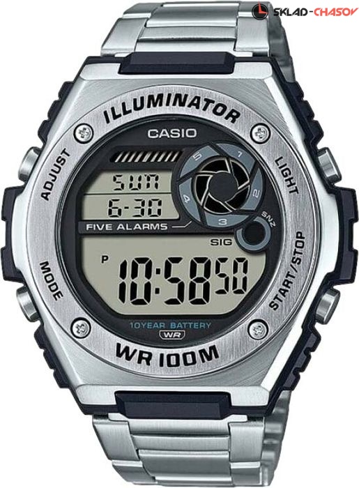 Часы Casio с секундомером и таймером на стальном браслете. Корпус выполнен из пластика со стальной накладкой. Циферблат подсвечивается ярким светодиодом. Функция задержки отключения - подсветка горит еще несколько секунд после отпускания кнопки освещения. Одновременное отображение текущего времени в двух разных часовых поясах.12-ти и 24-х часовой формат времени. Секундомер с точностью показаний 1/100 сек. и временем измерения 24 часа, сплит-хронограф (позволяет регистрировать отдельные отрезки времени, время с промежуточным результатом и время двойного финиша). Таймер обратного отсчета с автоповтором от 1 сек. до 24 часов. 5 независимых будильников, ежечасный сигнал. Полностью автоматический календарь, учитываются месяцы разной продолжительности и високосные годы. Задняя крышка из нержавеющей стали с креплением к корпусу на винтах. Батарея рассчитана на 10 лет. Водонепроницаемость в соответствии с ISO 2281. Вес часов 111 грамм. Гарантия 2 года.
