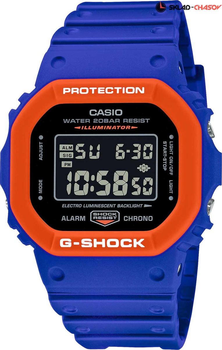 Современная расцветка этих противоударных часов придется по душе любителям экстрима. G-Shock. Новая модель часов в серии DW-5600. Противоударный корпус защищает механизм от ударов и вибрации. Электролюминесцентная подсветка освещает весь циферблат, после отпускания кнопки свечение продолжается еще некоторое время. Световая индикация сигнала. Цвет подсветки: сине-зеленый. 12-ти и 24-х часовой формат времени. Секундомер с двумя точностями показаний: 1/100с (до 1ч) и 1с (после 1ч) и временем измерения 24ч. SPLIT-хронограф. Таймер обратного отсчета от 1с до 24ч с автоповтором. Будильник с автоповтором. Типы сигналов: ежедневный, ежемесячный, каждый день определенного месяца, на определенную дату. Батарейка рассчитана на 2 года. Стальная задняя крышка крепится на 4-х винтах. Водонепроницаемость в соответствии с ISO 22810. Ремешок из полимерного материала с классической застежкой.