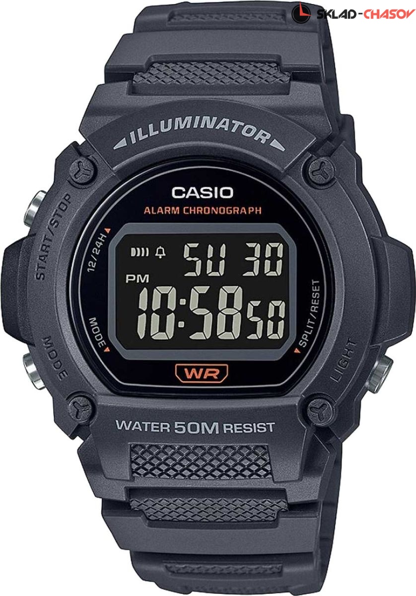 Удобные спортивные мужские часы Casio. 12-ти и 24-х часовой формат отображения времени. Циферблат подсвечивается светодиодом. Секундомер с точностью показаний 1/100 сек. и временем измерения 1 час, сплит-хронограф. Ежечасный сигнал. Батарея рассчитана на 7 лет работы. Ремешок с классической застежкой. Вес часов 40 грамм.Гарантия 2 года.