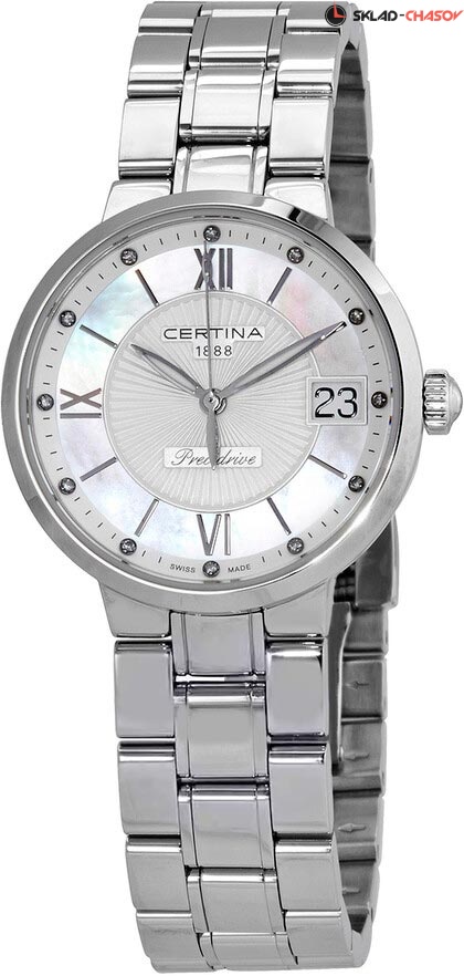 Точный швейцарский механизм в элегантном корпусе - стильное дополнение продуманного имиджа. Кварцевые женские наручные часы. Фирменная технология PreciDrive обеспечивает погрешность не более +/-10 сек в год (в 10 раз точнее обычных кварцевых часов). Круглый стальной корпус c полированной поверхностью. Двухуровневый циферблат с радиальным декоративным узором и перламутровой вставкой, с накладными метками в виде штрихов и римских цифр, украшен бриллиантами. Листовидные стрелки в стиле Feuille с люминесцентным покрытием, которое светится в темноте после непродолжительной зарядки на свету. Окошко даты находится в положении 3 часа. Рифленая заводная головка. Задняя крышка украшена гравировкой. Надежный стальной браслет с раскладывающейся застежкой. Застежка с системой блокировки.